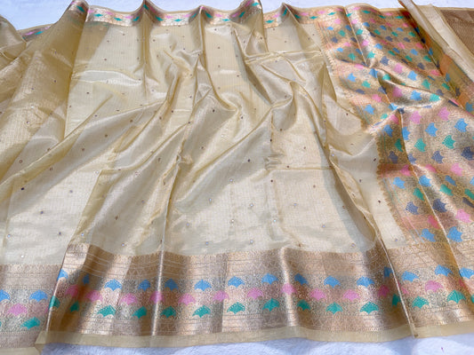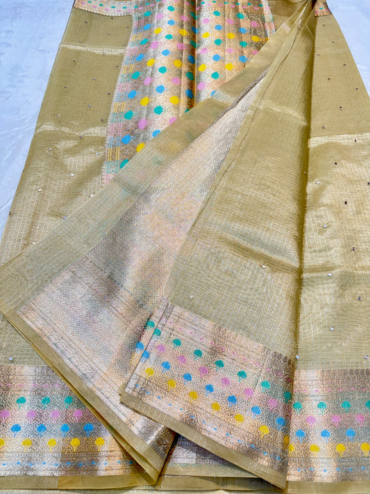 Gold shade tissue kota mirror work premium Banarasi saree