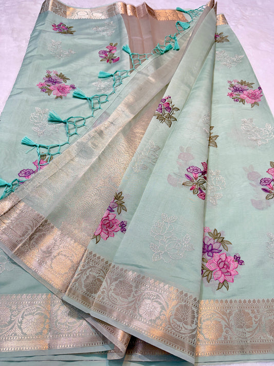 Sea green shade tissue kota designer embroidery premium Banarasi saree