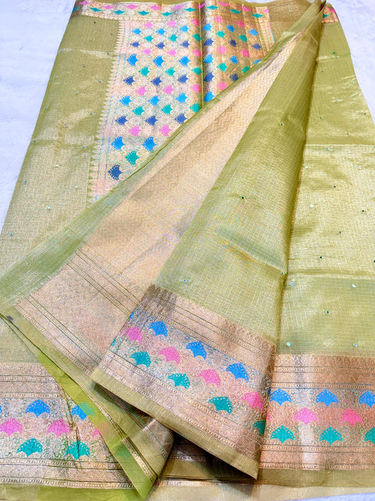 Pista green shade tissue kota mirror work premium Banarasi saree