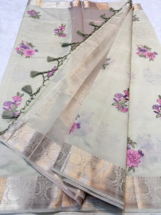 Beige shade tissue kota designer embroidery premium Banarasi saree