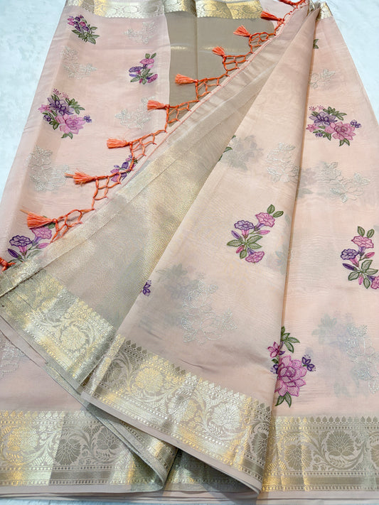 Beige shade tissue linen designer embroidery premium Banarasi saree
