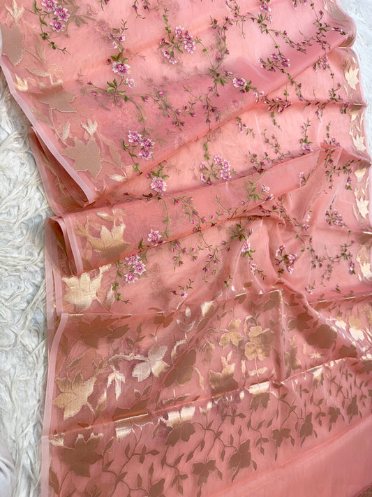 Peach shade kora organza embroidery Banarasi saree