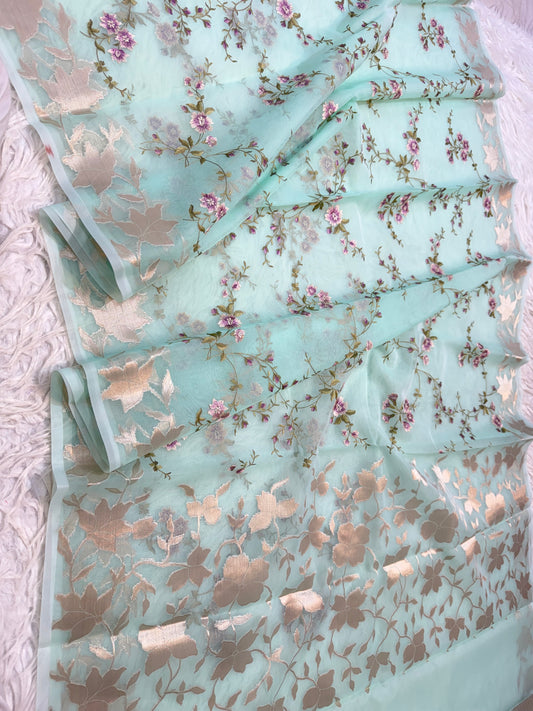 Turquoise shade kora organza embroidery Banarasi saree