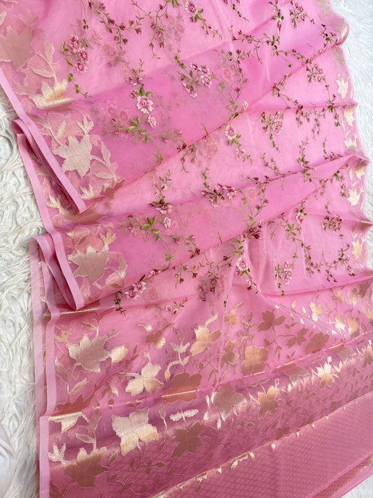 Pink shade kora organza embroidery Banarasi saree