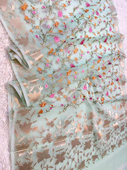 Pista green shade organza embroidery Banarasi saree