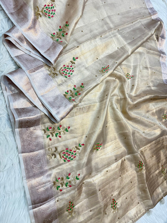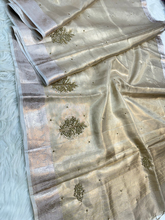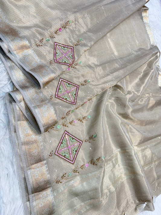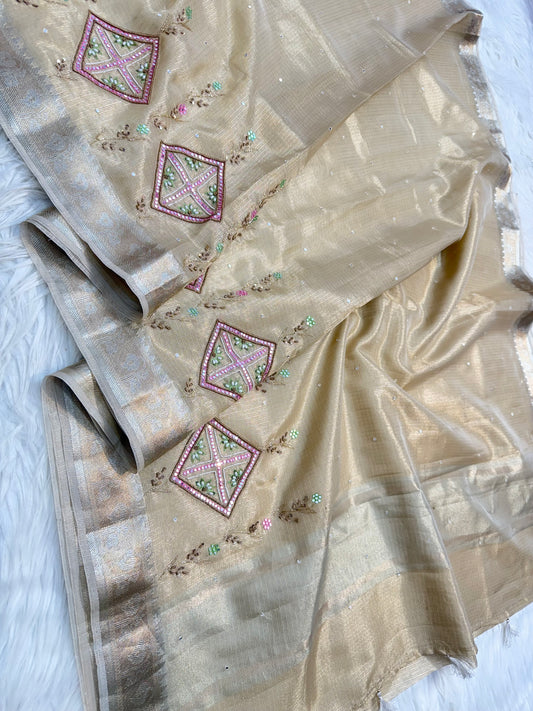 Beige shade tissue kota zardosi work premium Banarasi saree
