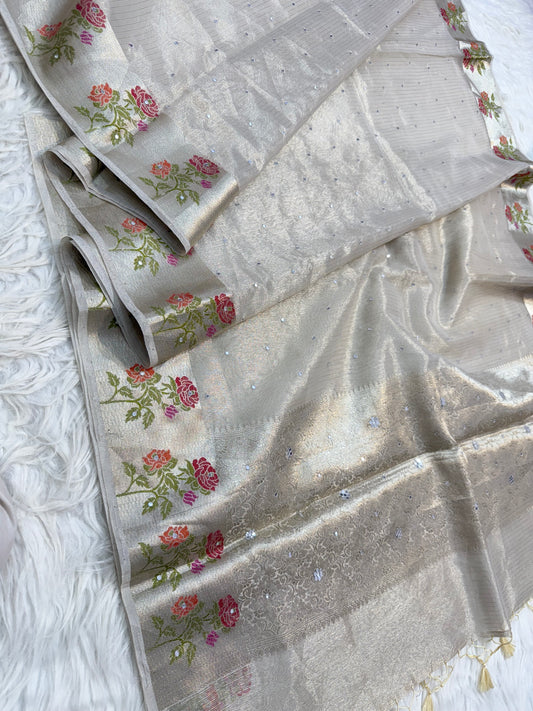 Silver shade tissue kota mirror work premium Banarasi saree