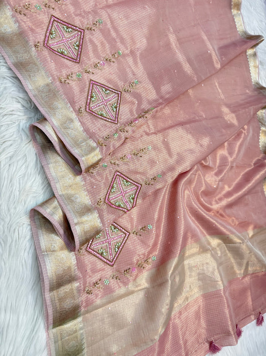 Pink shade tissue kota zardosi work premium Banarasi saree