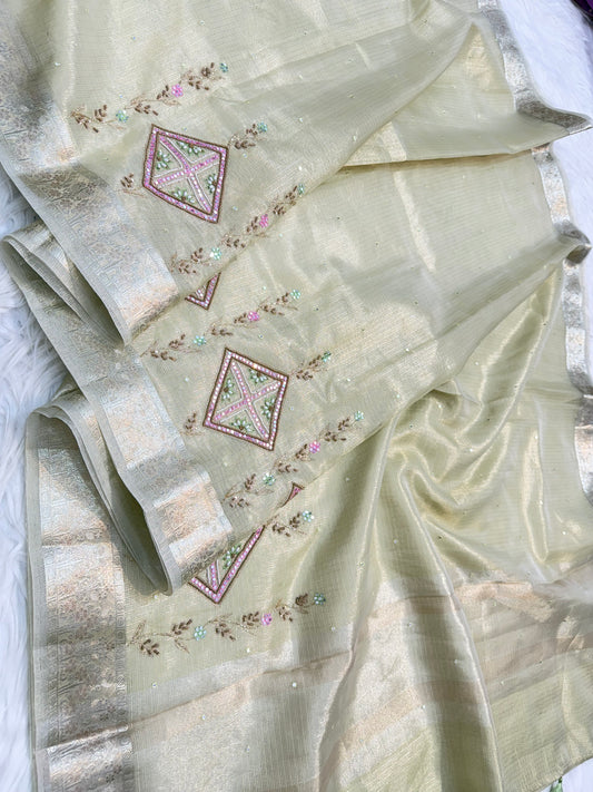 Pista green shade tissue kota zardosi work premium Banarasi saree