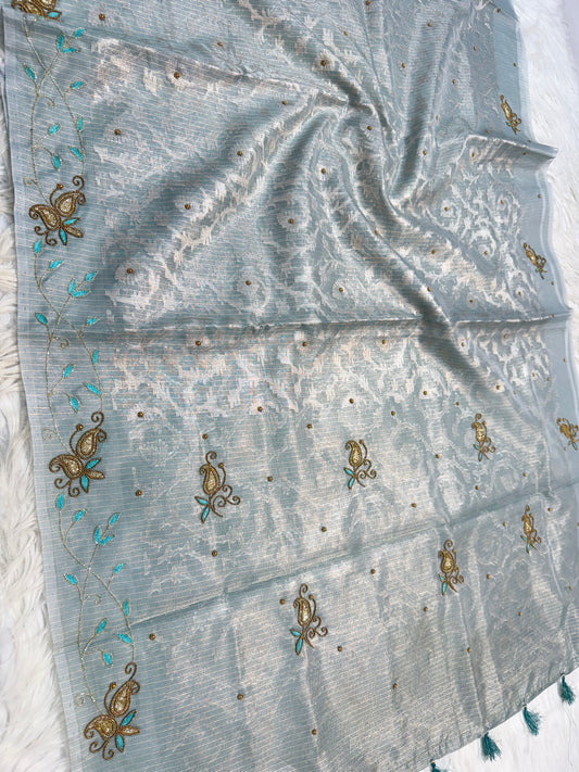 Silver shade tissue ari & zardosi work designer premium Banarasi saree