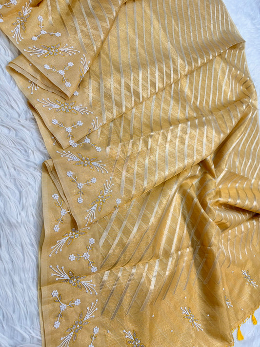 Yellow shade tissue ari & zardosi work designer premium Banarasi saree