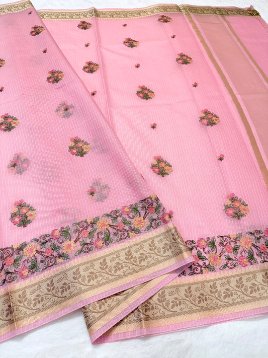 Pink shade cotton kota chickenkari embroidery Banarasi saree