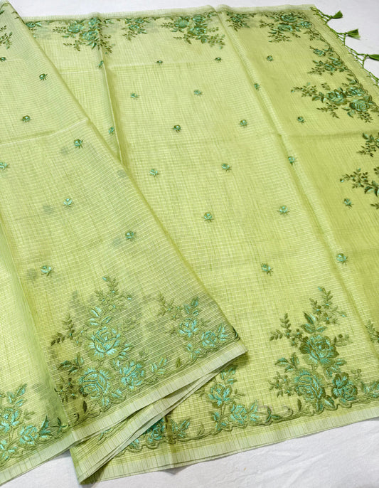 Pista green shade cotton kota chickenkari embroidery Banarasi saree