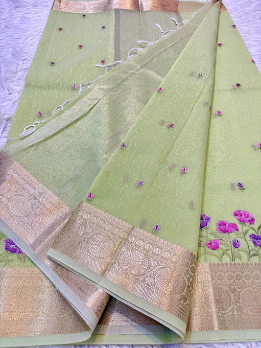 Pista green shade linen embroidery Banarasi saree