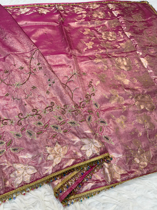Royal pink shade tissue ari & zardosi work designer premium Banarasi saree