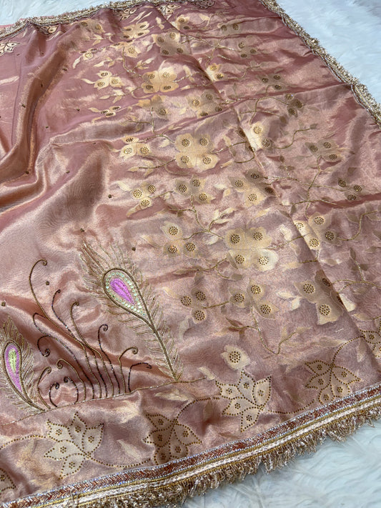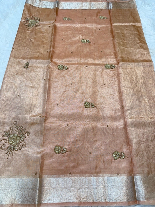Peach shade tissue ari & zardosi work designer premium Banarasi saree