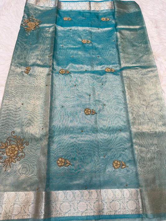 Turquoise shade tissue ari & zardosi work designer Banarasi saree