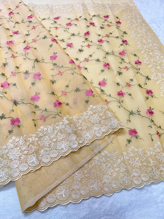 Yellow shade organza designer cutwork premium embroidery Banarasi saree