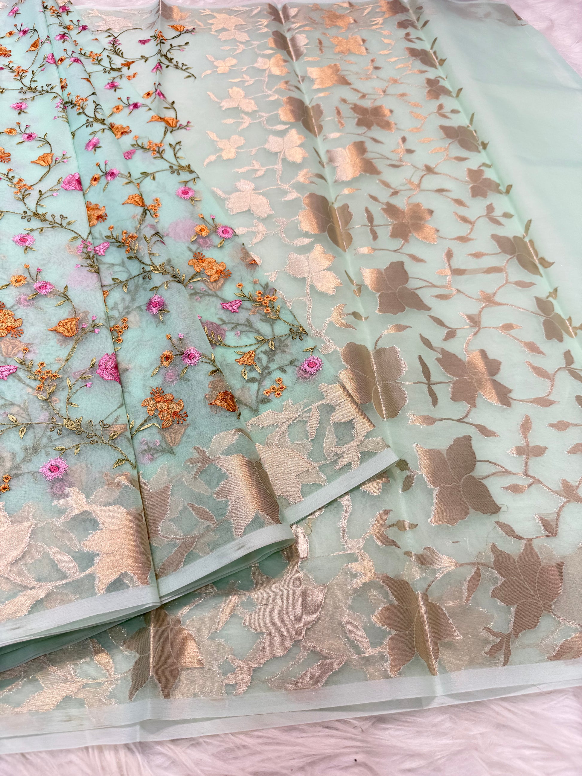 Indulge in the Royalty of Banaras with Zahera Silk's Banarasi Kora Organza Embroidery Saree. Handwoven with intricate detailing, this saree exudes elegance and grace. Perfect for special occasions, it will make you stand out and leave a lasting impression. Elevate your wardrobe with this timeless piece.