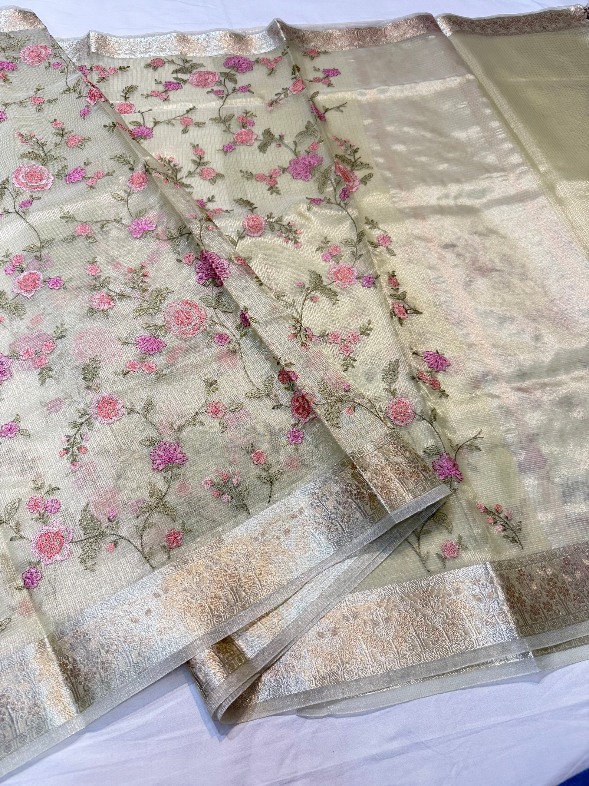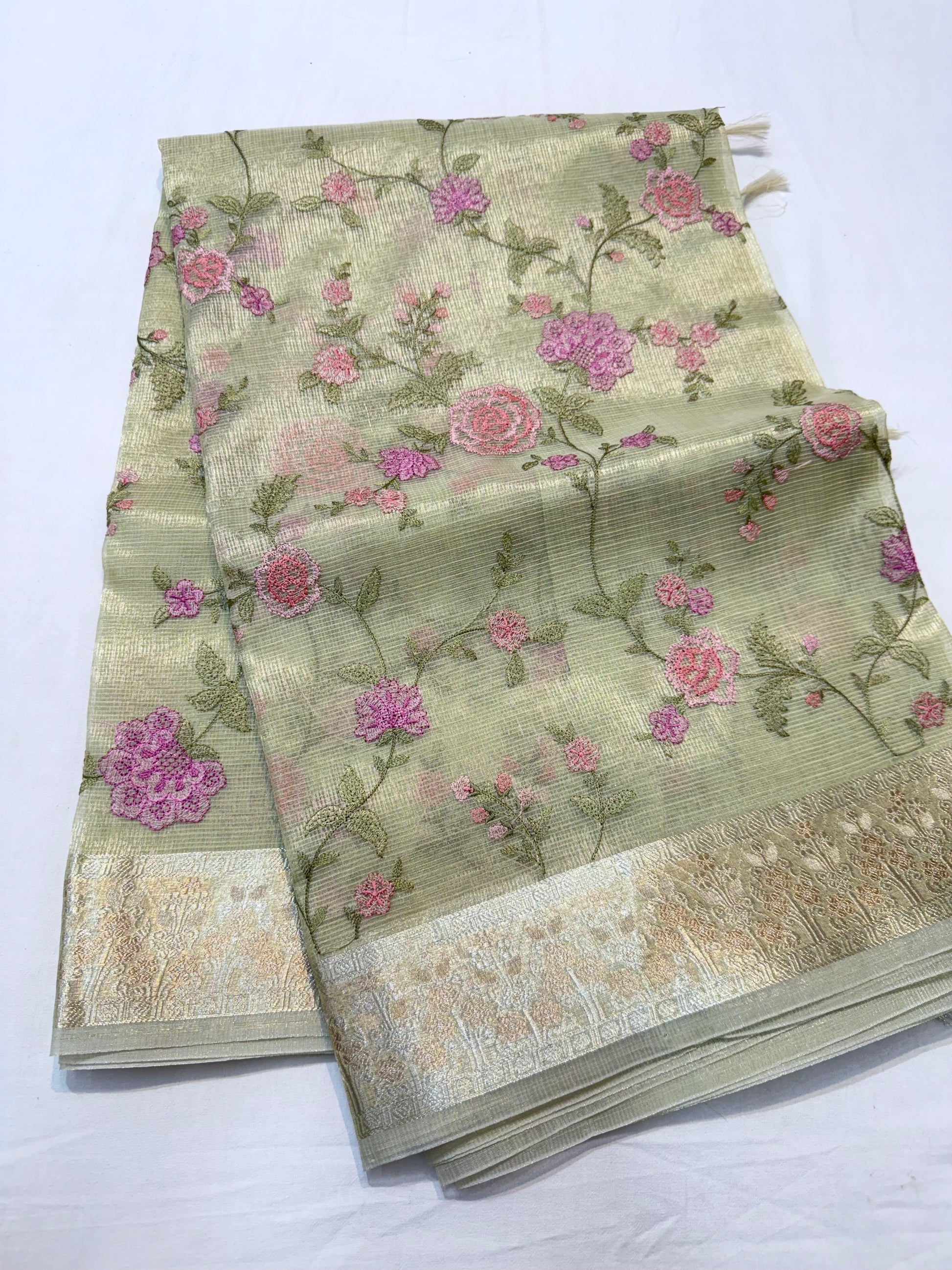 Pista green shade tissue kota embroidery primum Banarasi saree