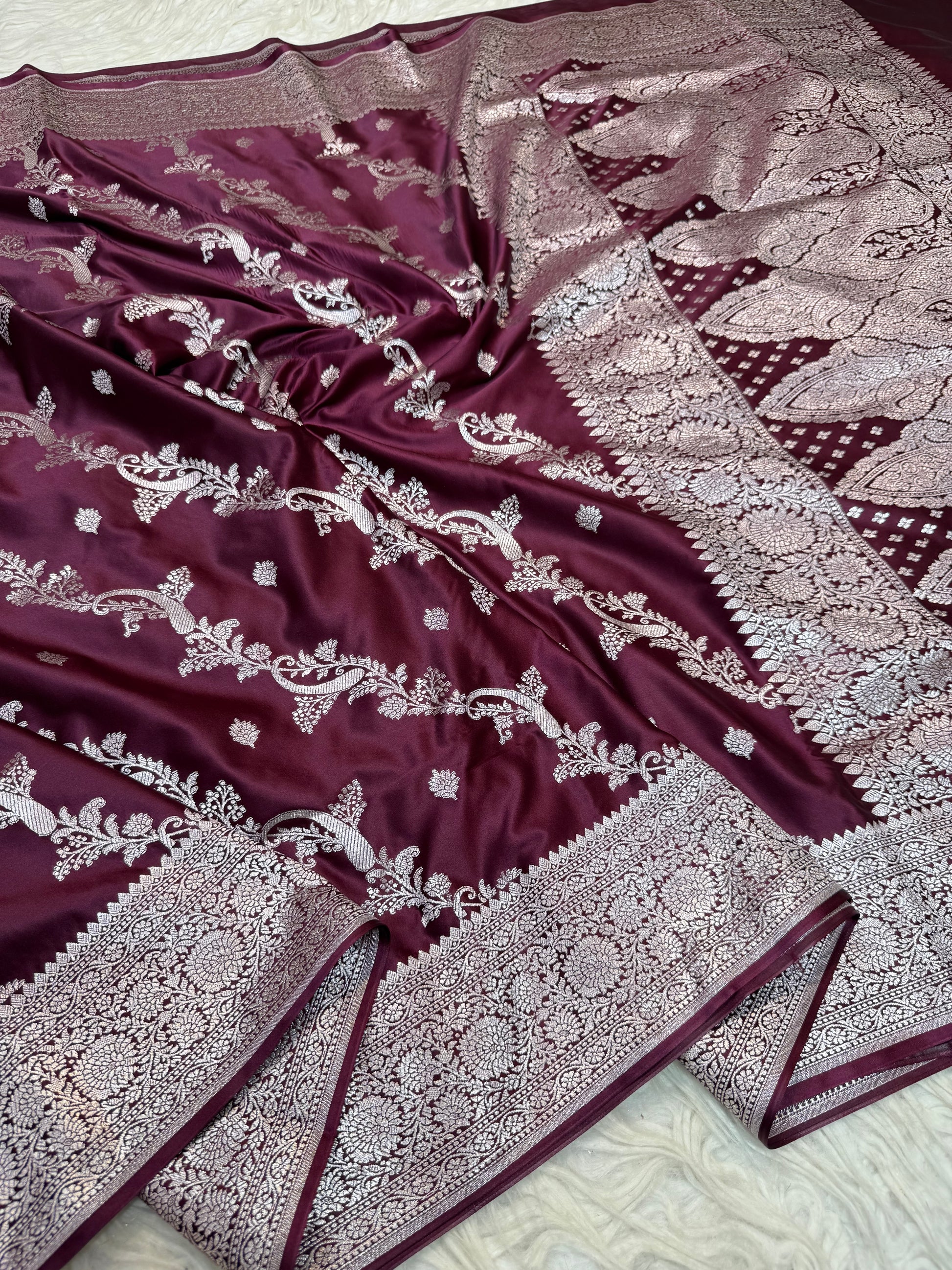 Discover the luxurious world of Zahera Silk Banaras with our Mashru Silk Banarasi Saree. Crafted from the finest Mashru Silk, this saree combines opulence with tradition. Adorn yourself with this exclusive piece and experience the elegance and grace of Banarasi artistry.