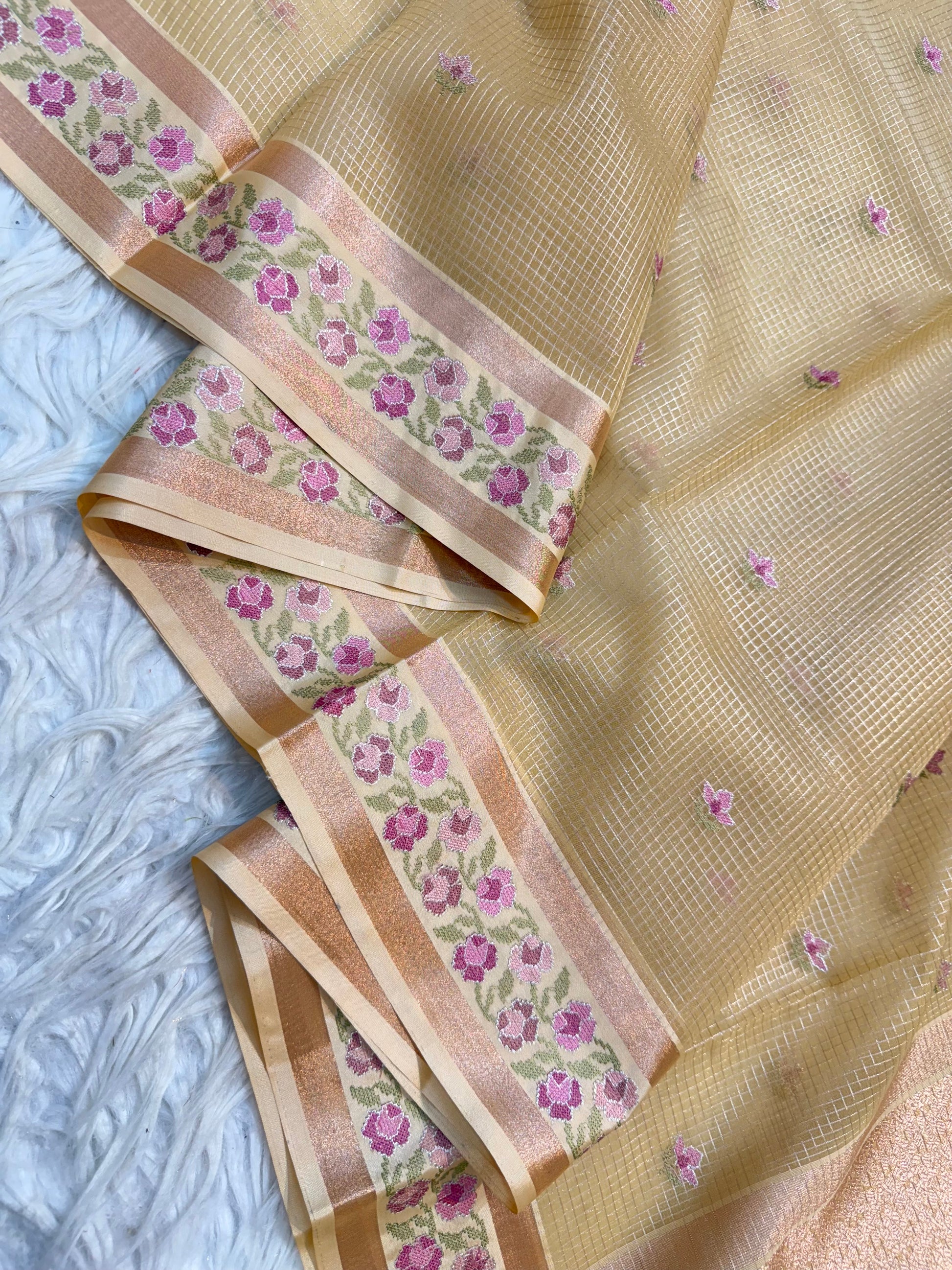 Beige shade kora organza embroidery Banarasi saree