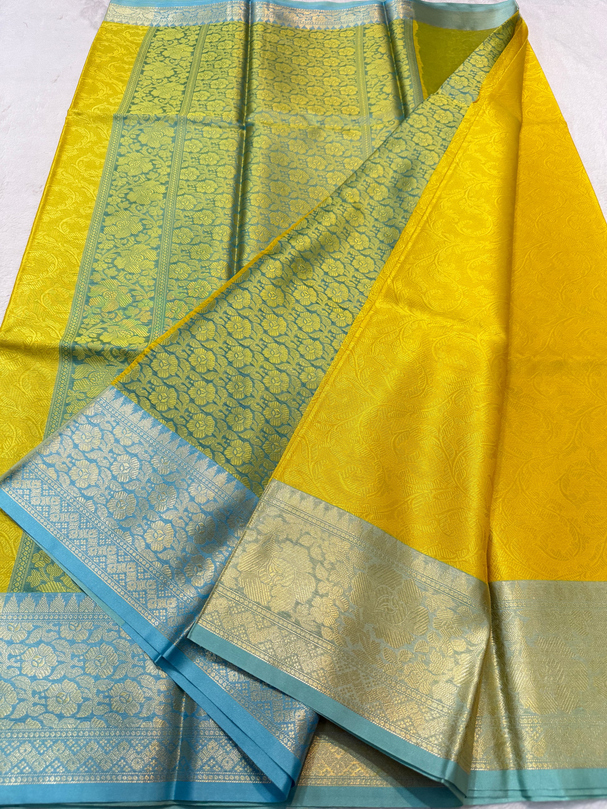 Gold firozi shade kora silk premium Banarasi saree