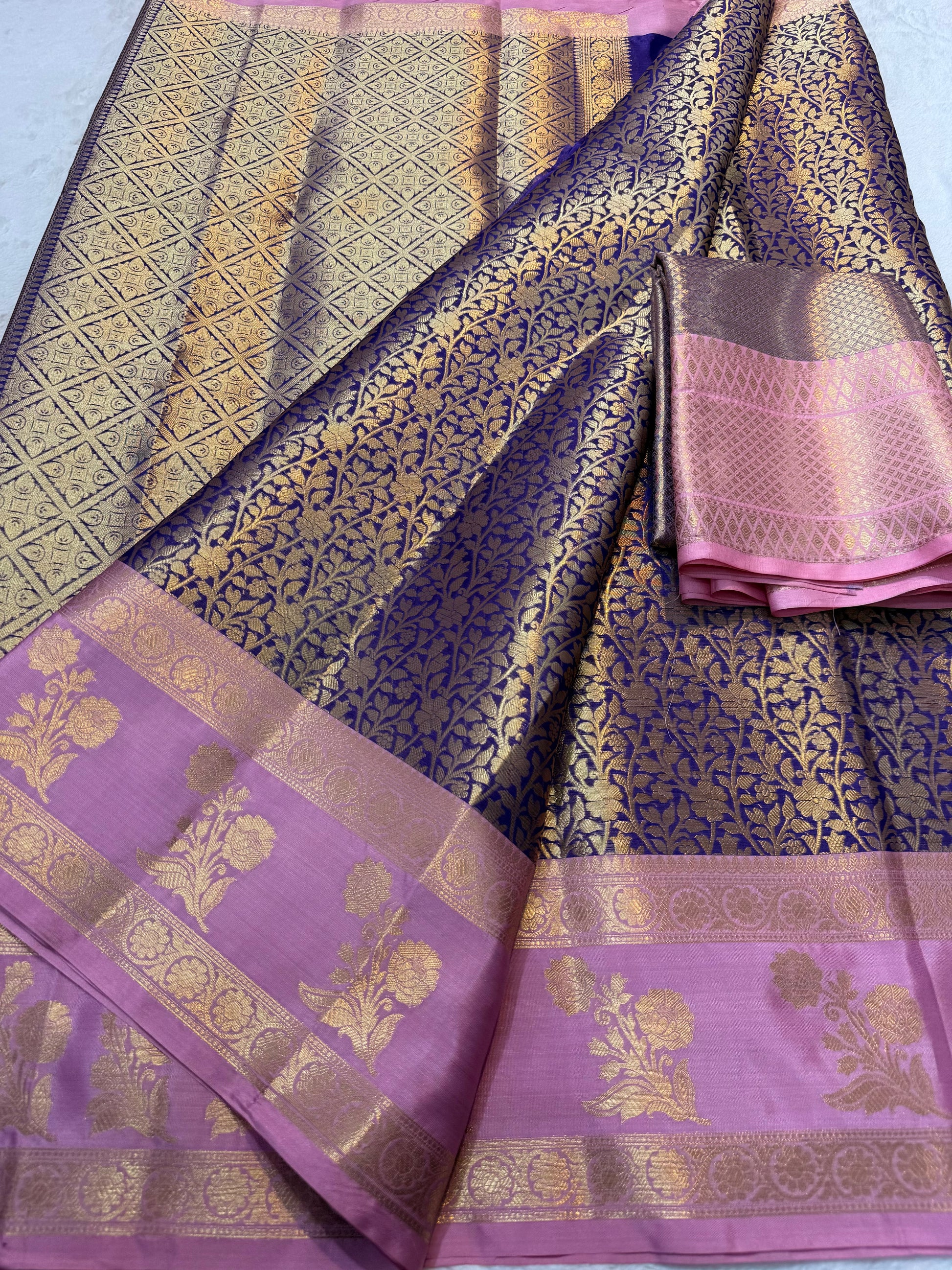 Navy peach shade Kanchi silk premium Banarasi saree