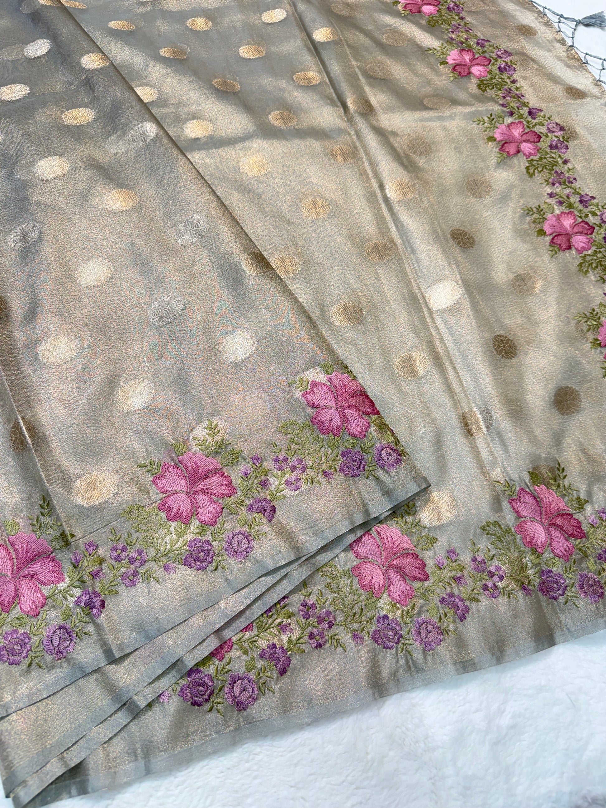 Grey tissue cutwork embroidery premium designer Banarasi saree