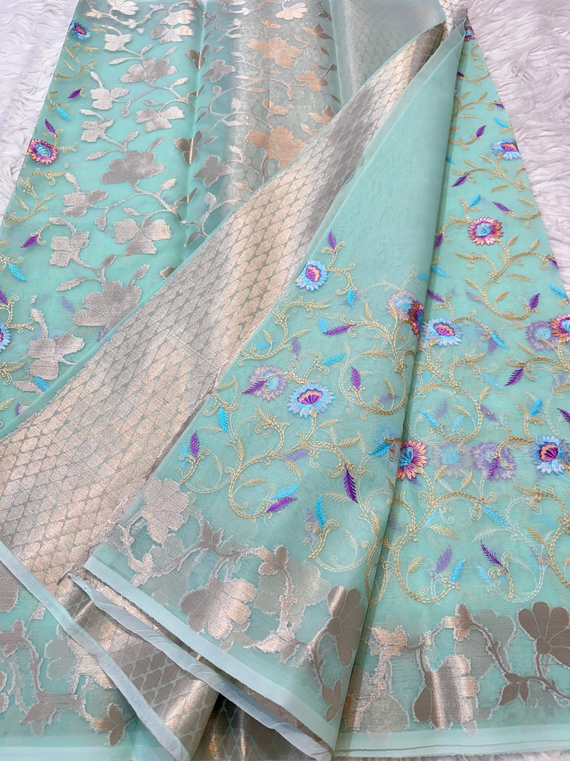 Turquoise kora organza embroidery Banarasi saree