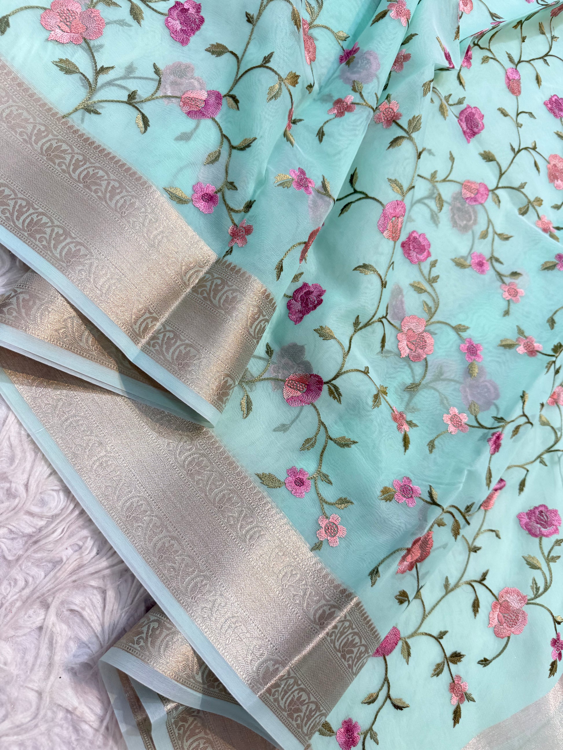 Turquoise shade organza embroidery Banarasi saree