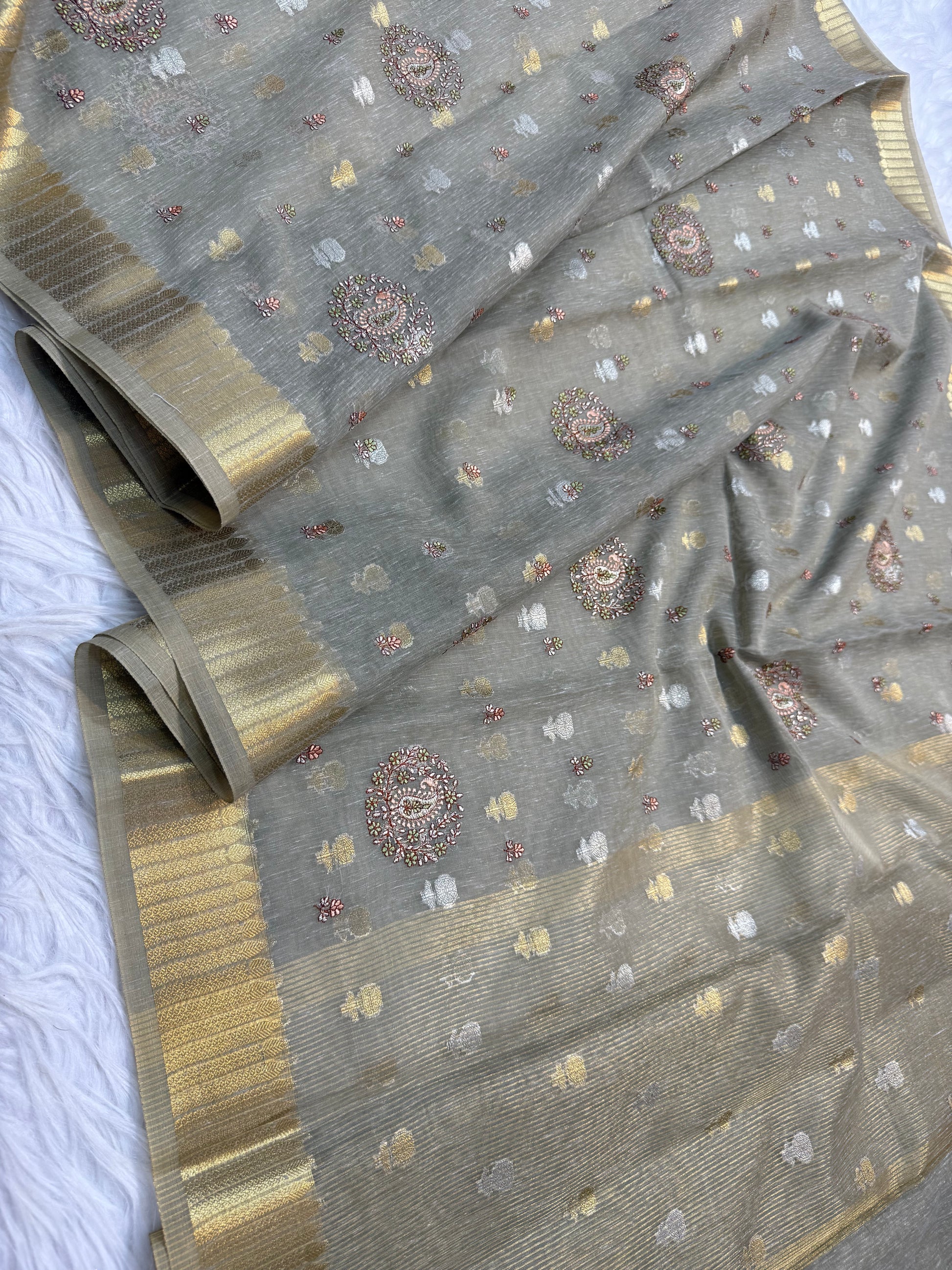 Grey shade linen embroidery Banarasi saree