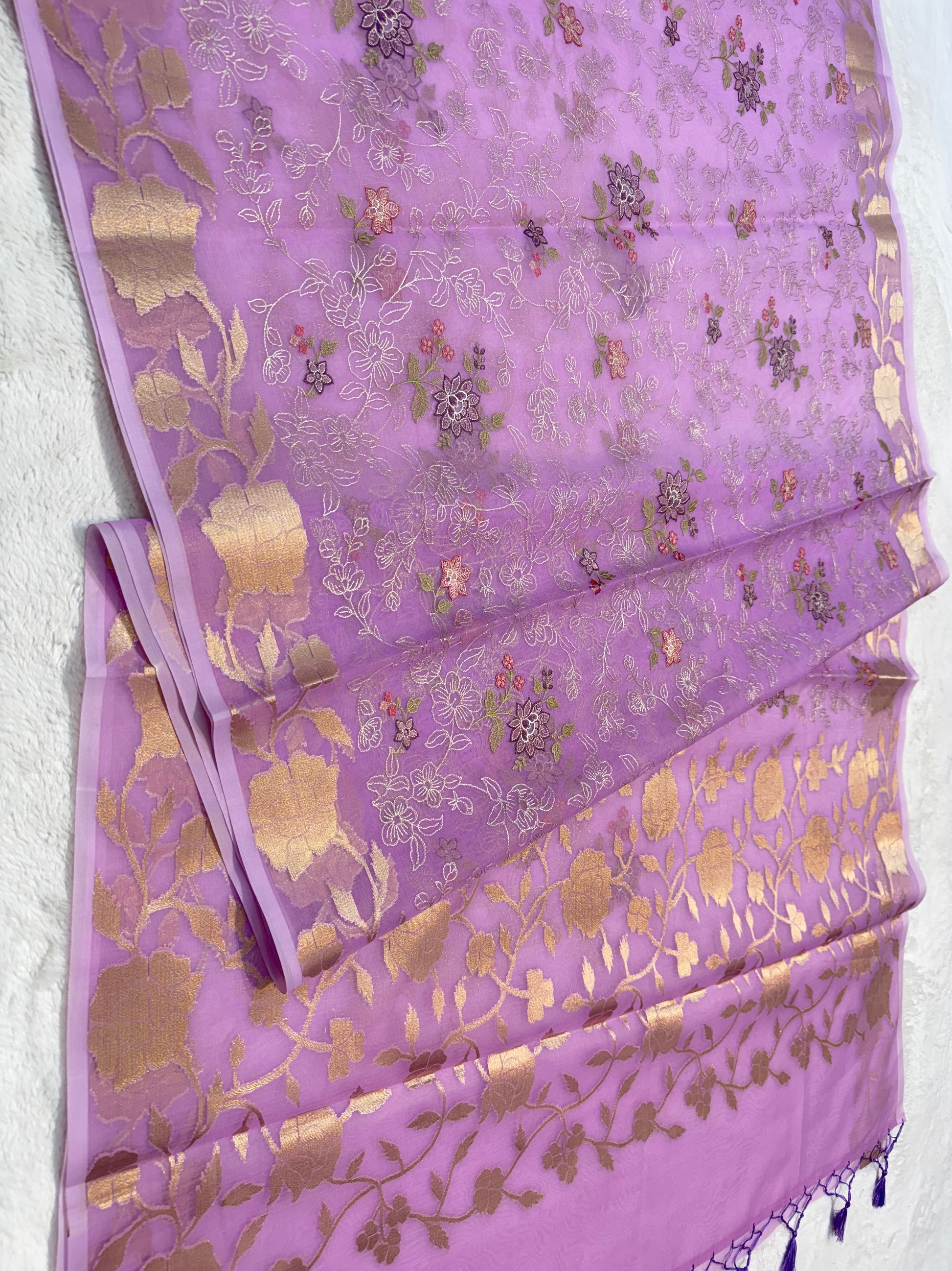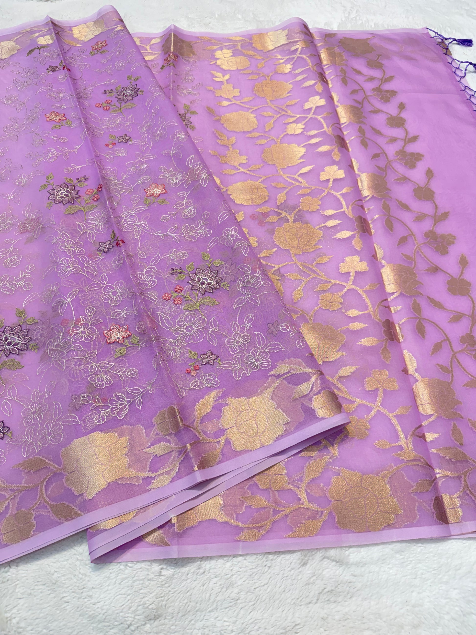 Lavender shade organza designer embroidery premium Banarasi saree