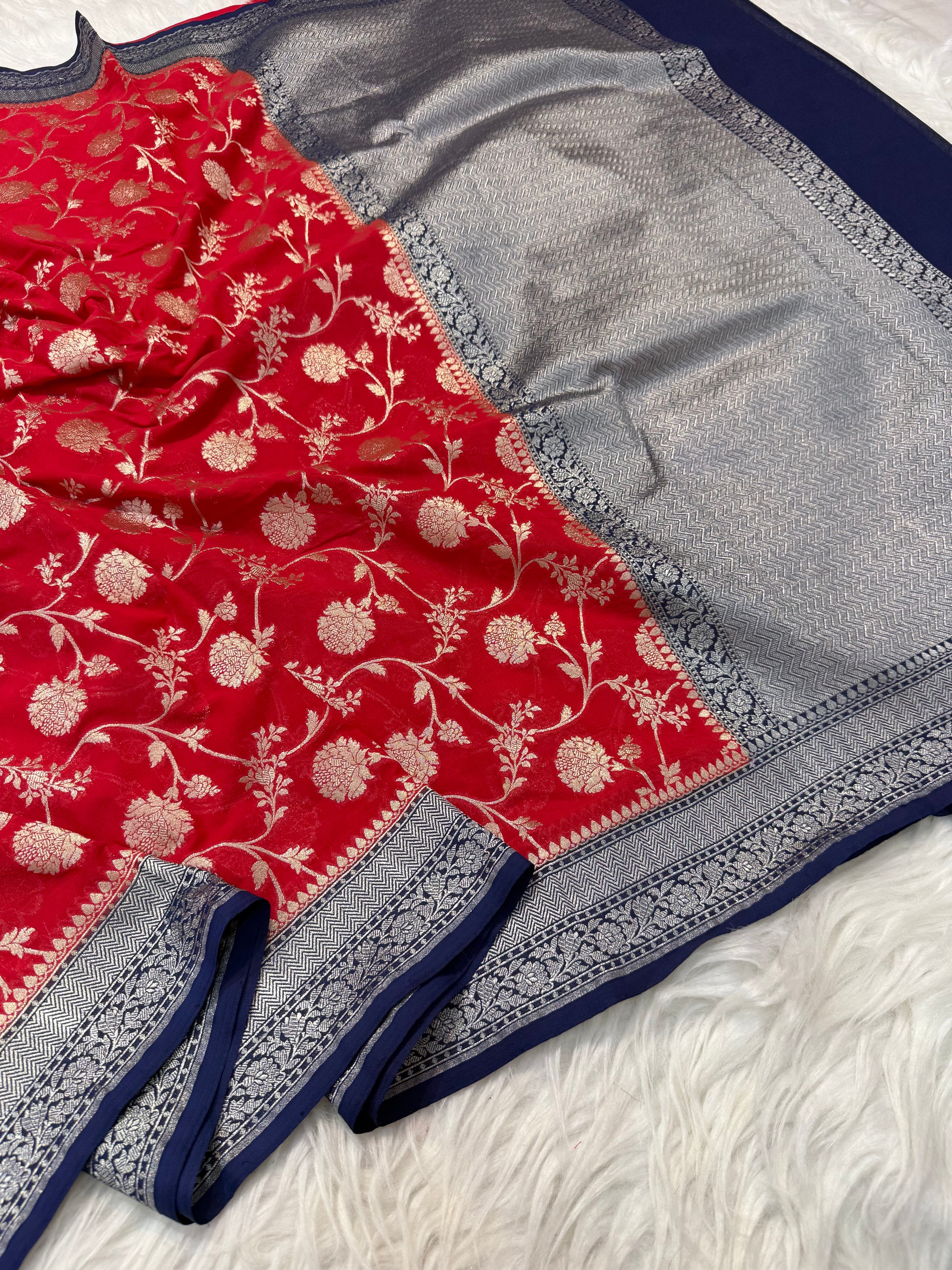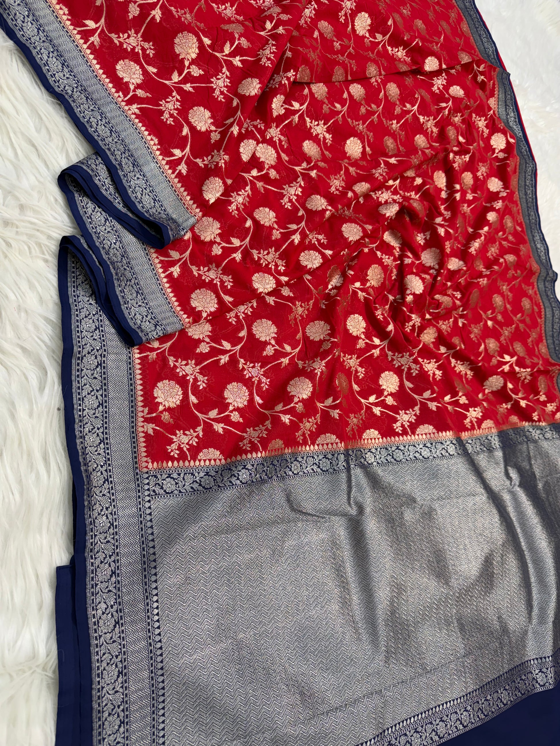 Red nevy shade khaddi georgatte premium Banarasi saree