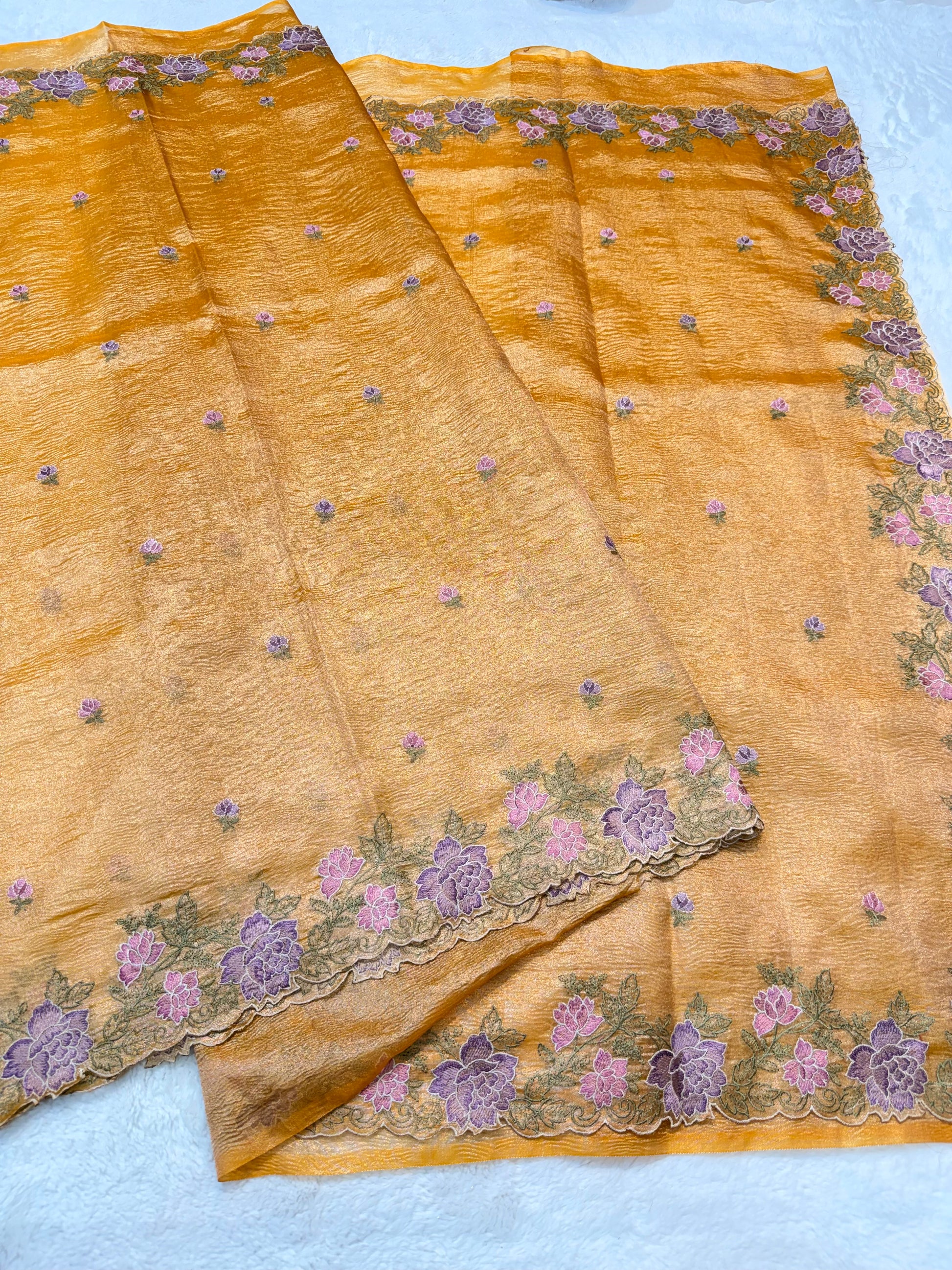 Gold shade tissue crush cutwork embroidery premium designer Banarasi saree