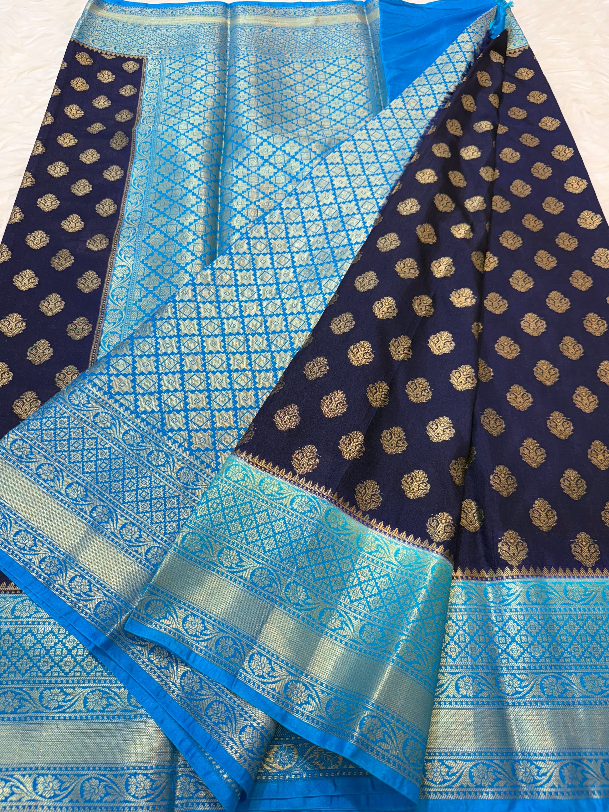 Elevate your ethnic collection with the nevy & sea green Dupion Silk Banarasi Booti Saree from Zahera Silk Banaras. Crafted from rich dupion silk, this saree blends vibrant yellow and deep red hues, adorned with intricate Banarasi booti patterns. Its luxurious texture and timeless design make it perfect for festive occasions and special celebrations, offering graceful elegance and refined beauty.