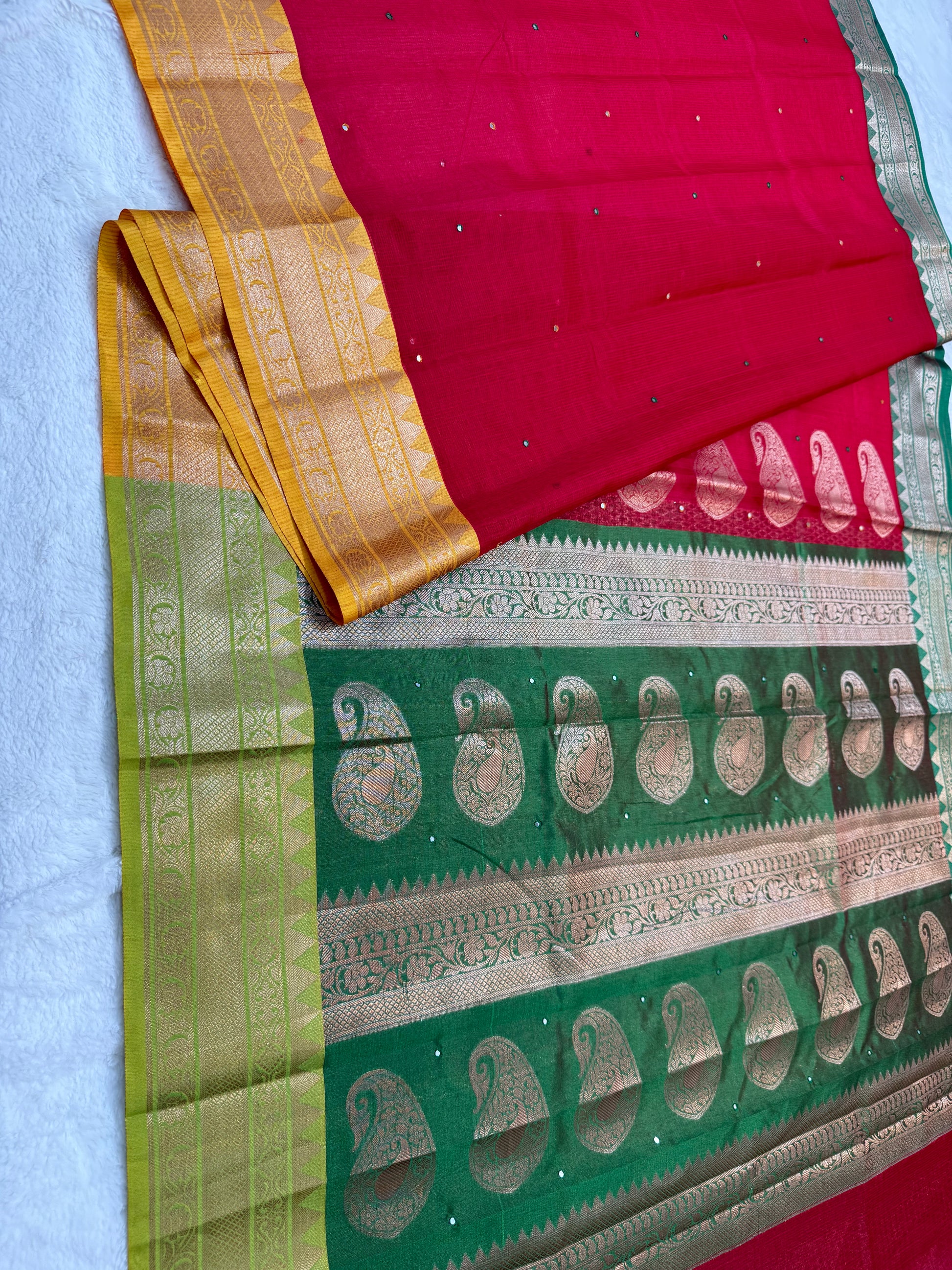 Red & mustard green shade kota mirror work premium Banarasi saree