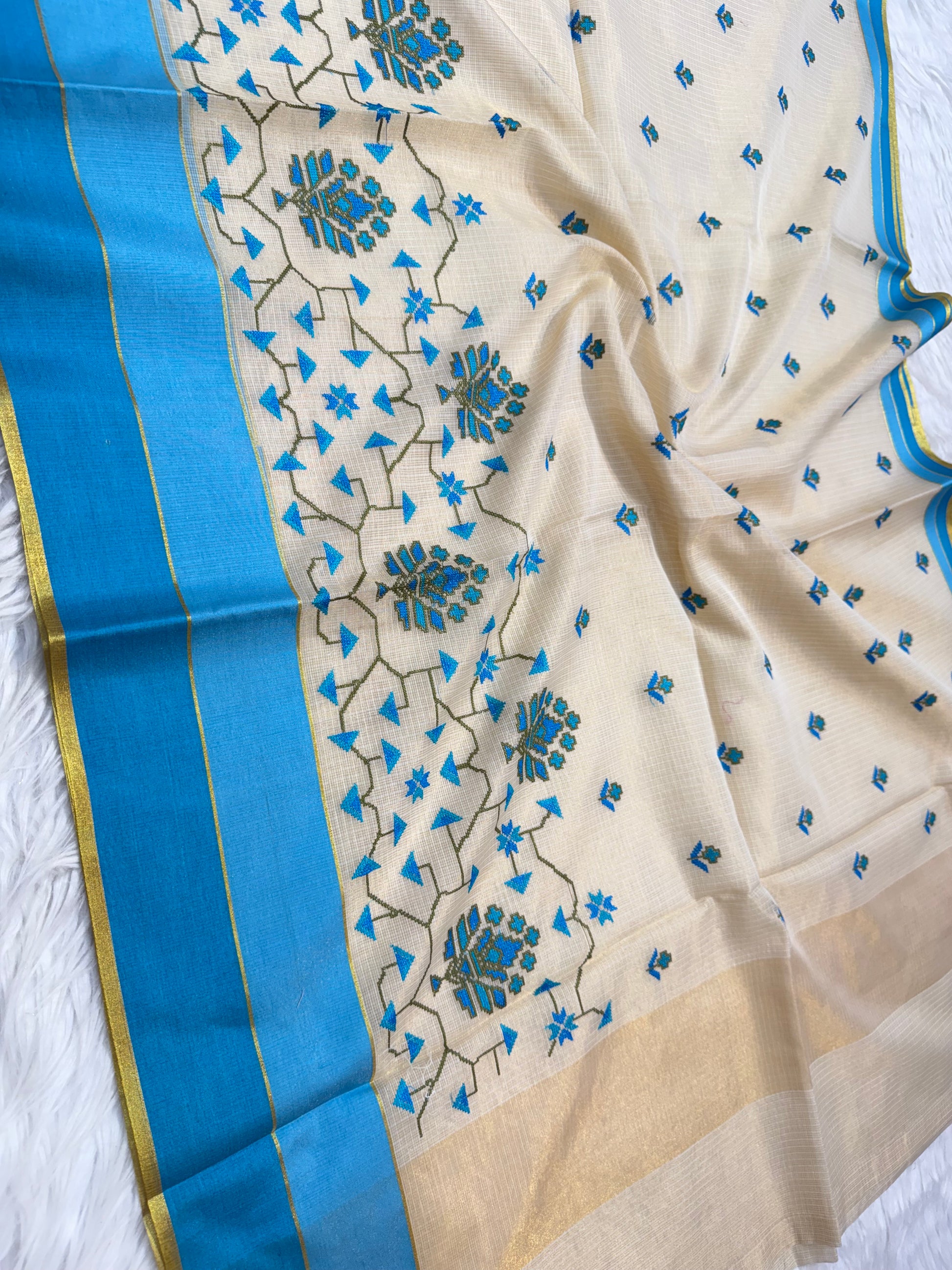 Off white powder blue shade tissue kota embroidery Banarasi saree