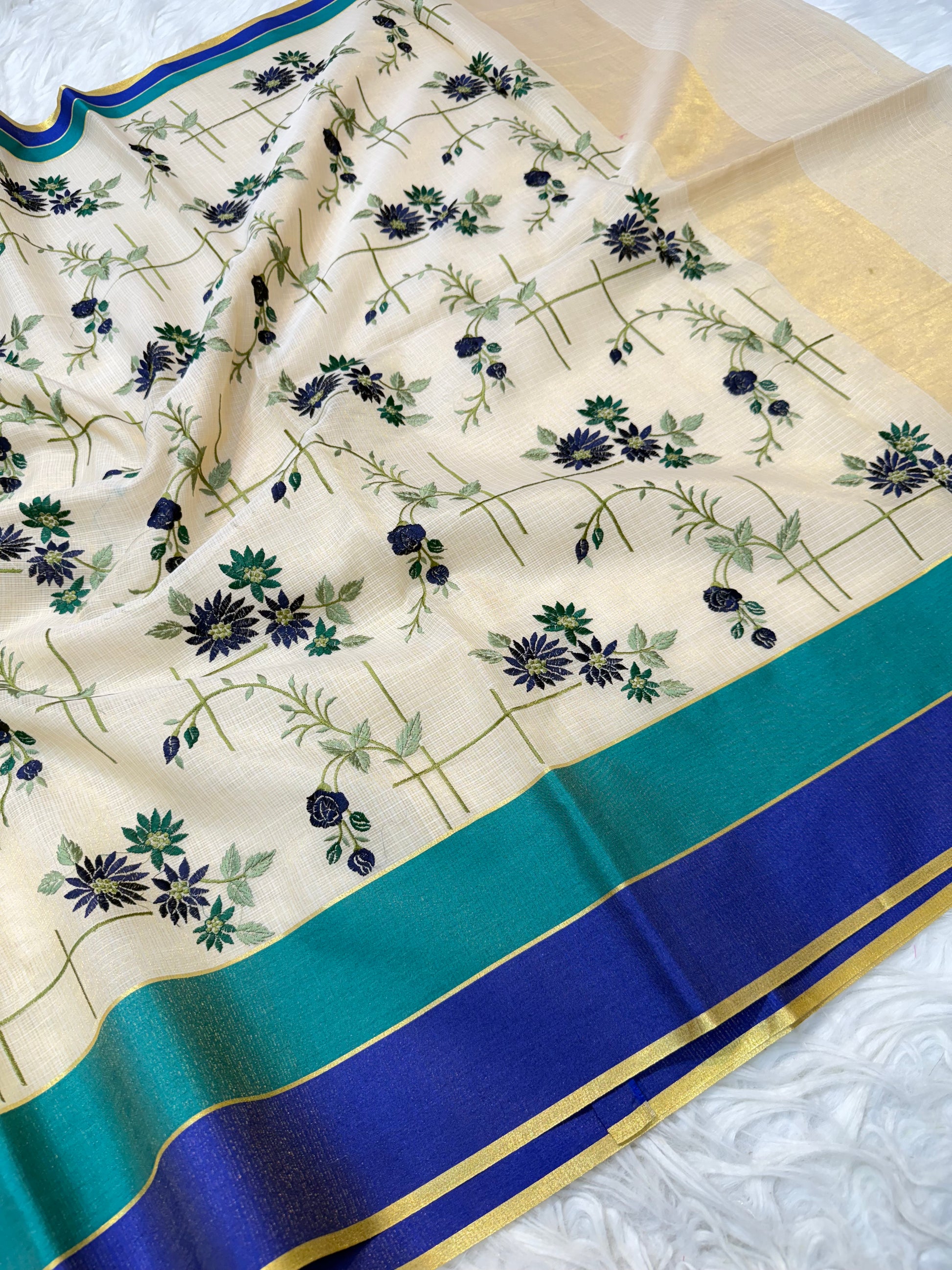 Off white nevy sea green shade tissue kota embroidery Banarasi saree