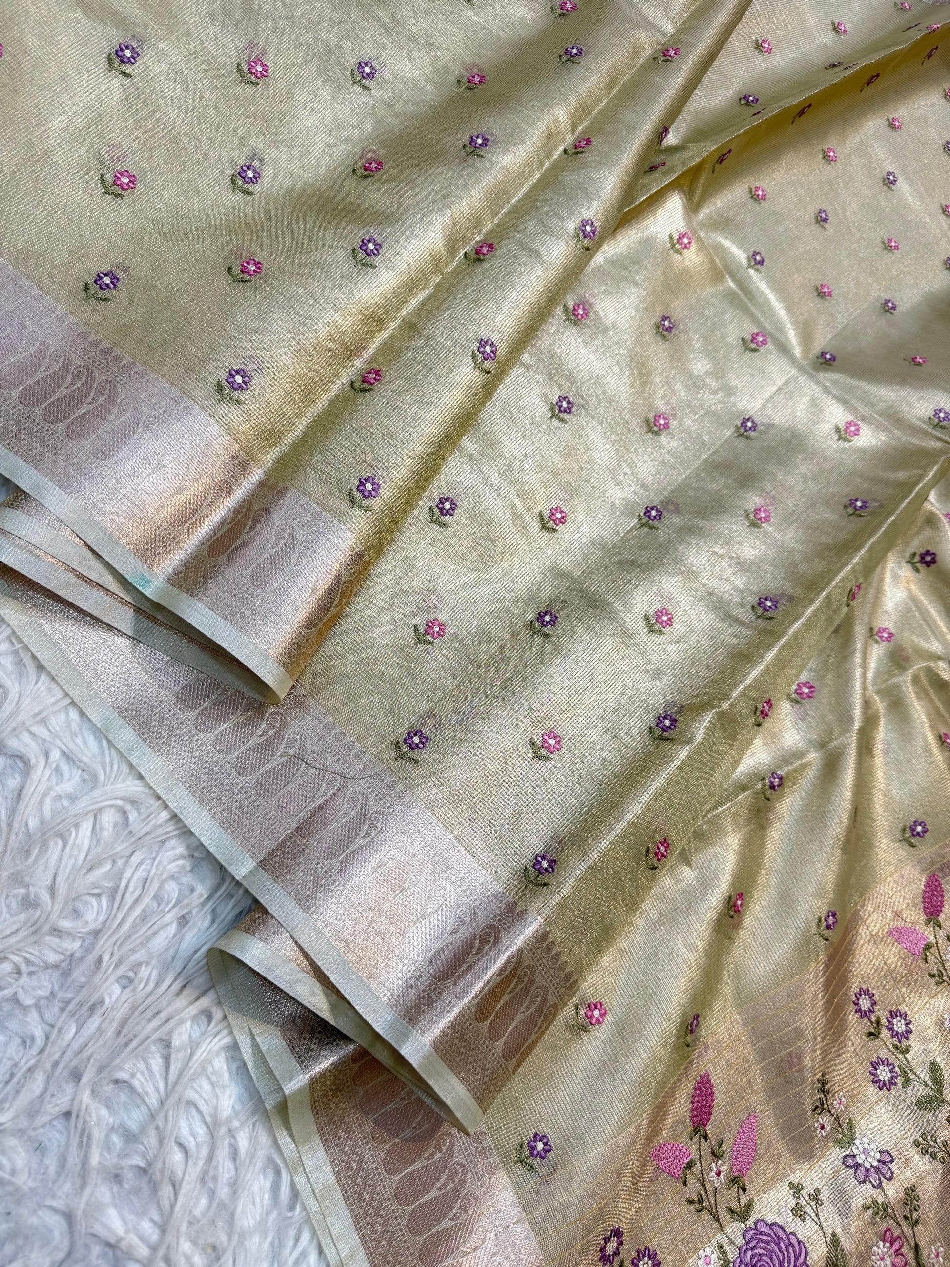 Pista green shade tissue kota embroidery primum Banarasi saree