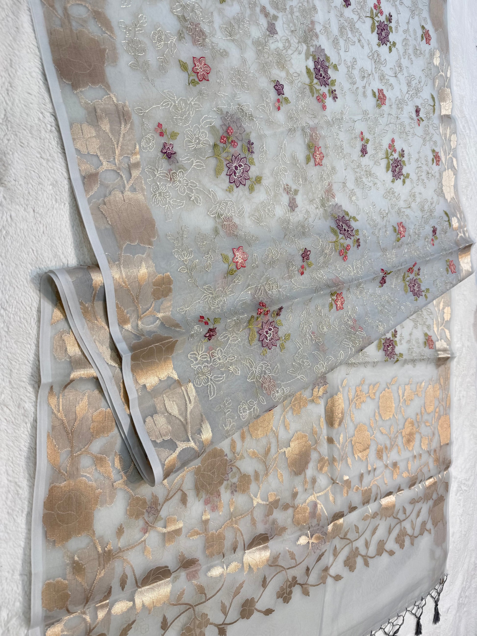 Grey shade organza designer embroidery premium Banarasi saree