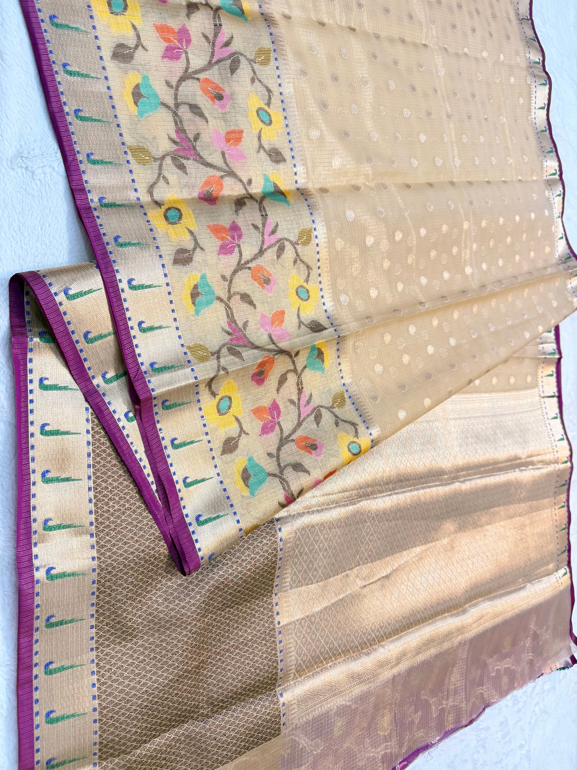 Gold & multicolour shade tissue kota premium paithani border designer banarasi saree