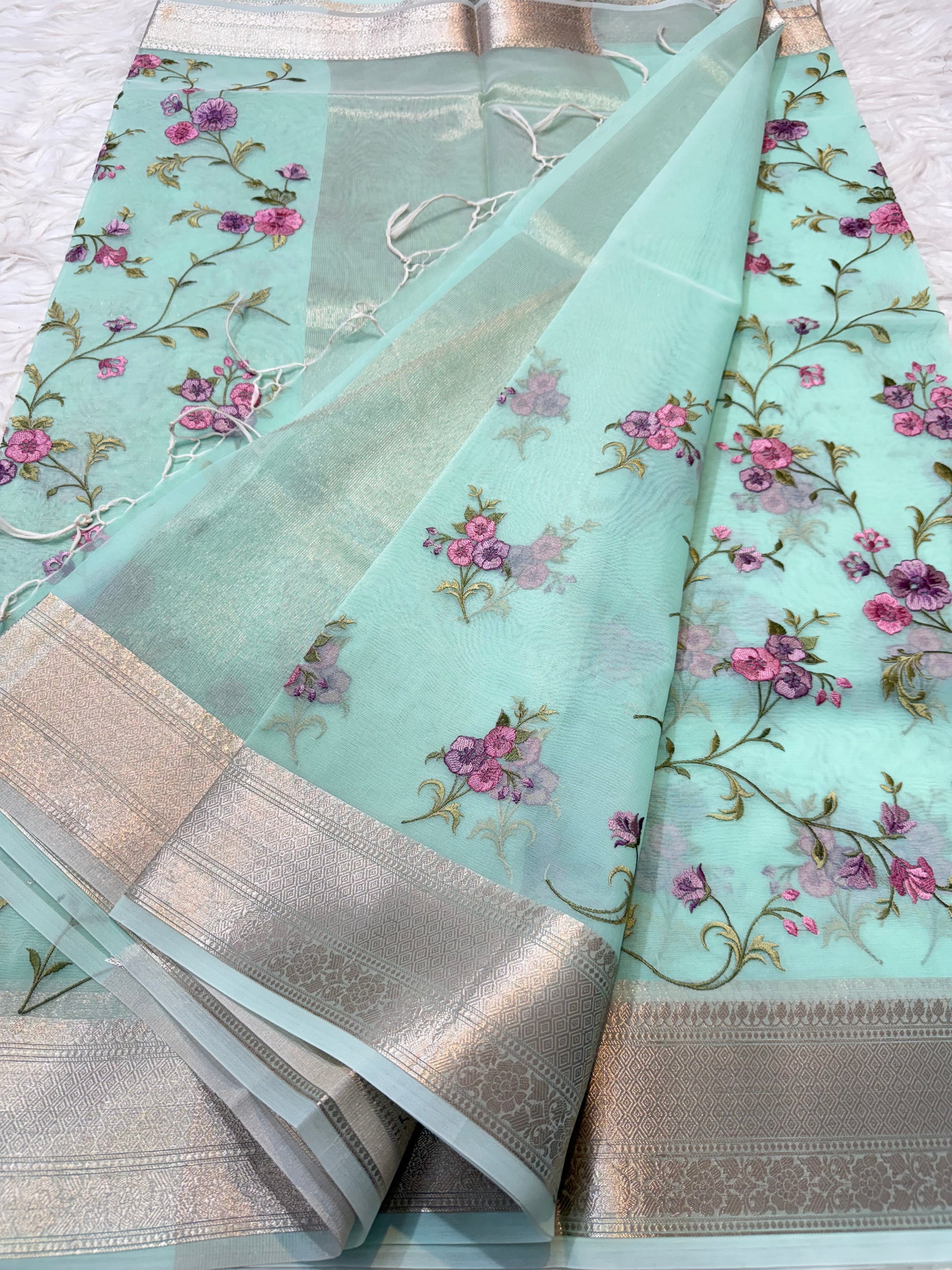 Turquoise shade organza embroidery Banarasi sareeZSB721