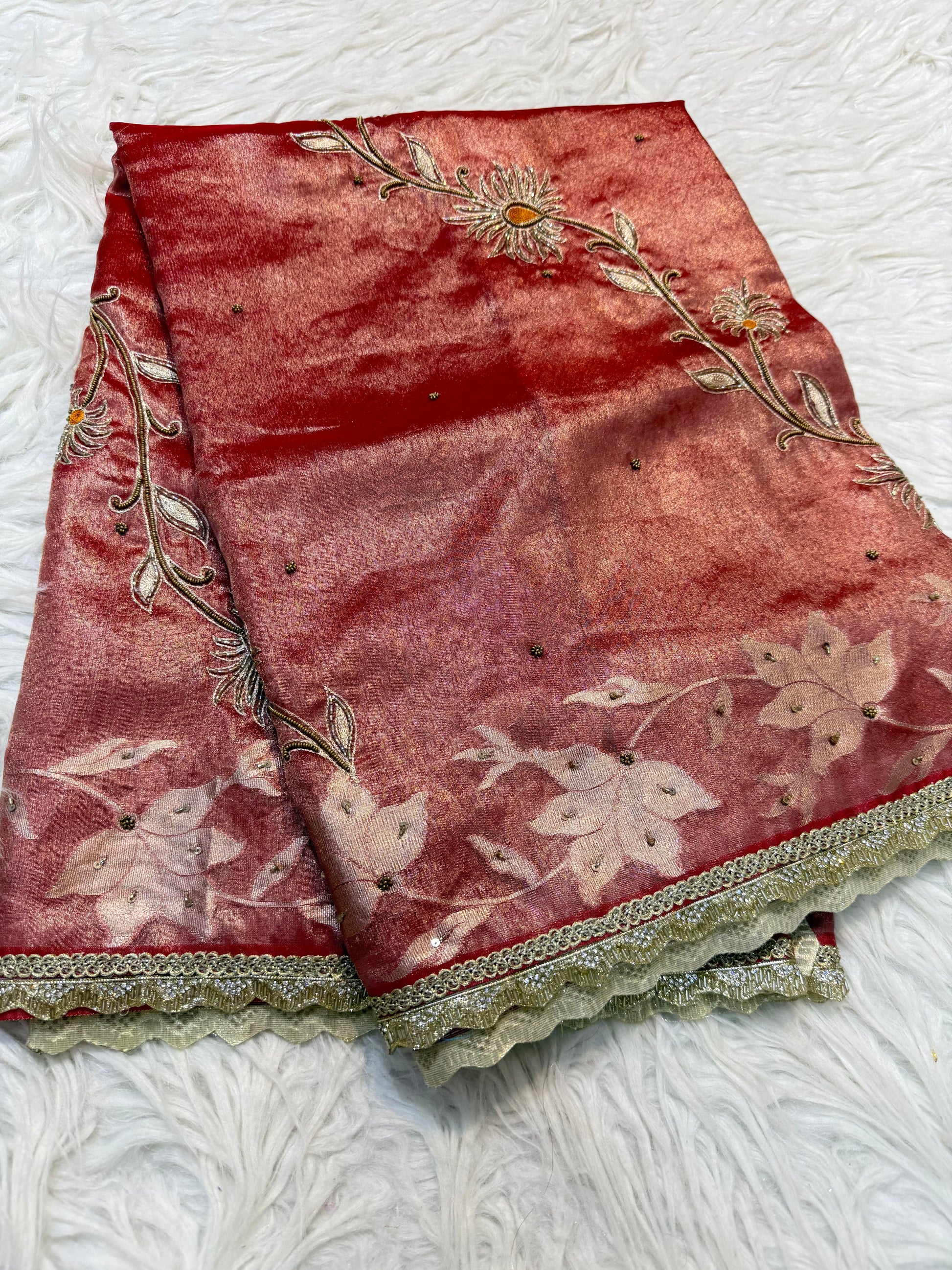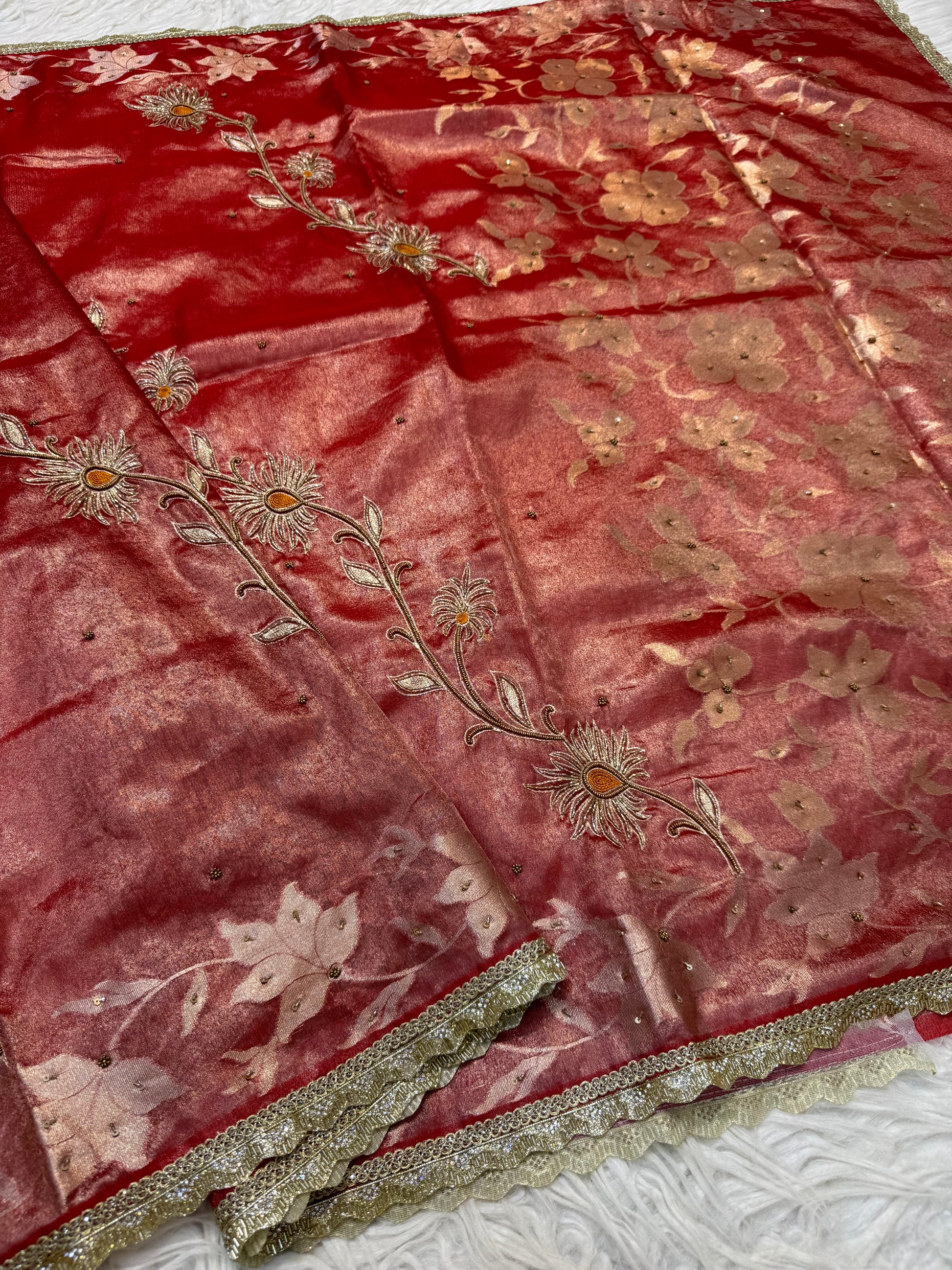 Red shade tissue ari & zardosi work designer premium Banarasi saree