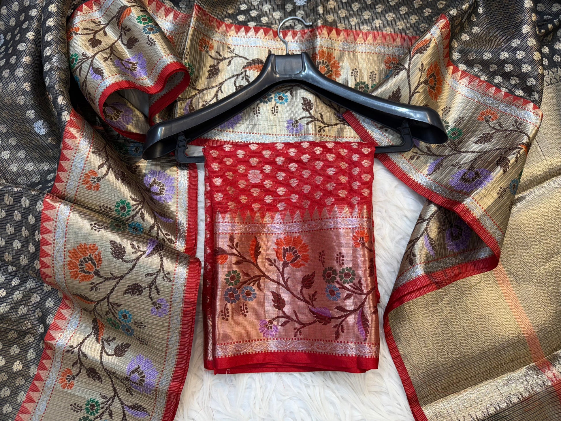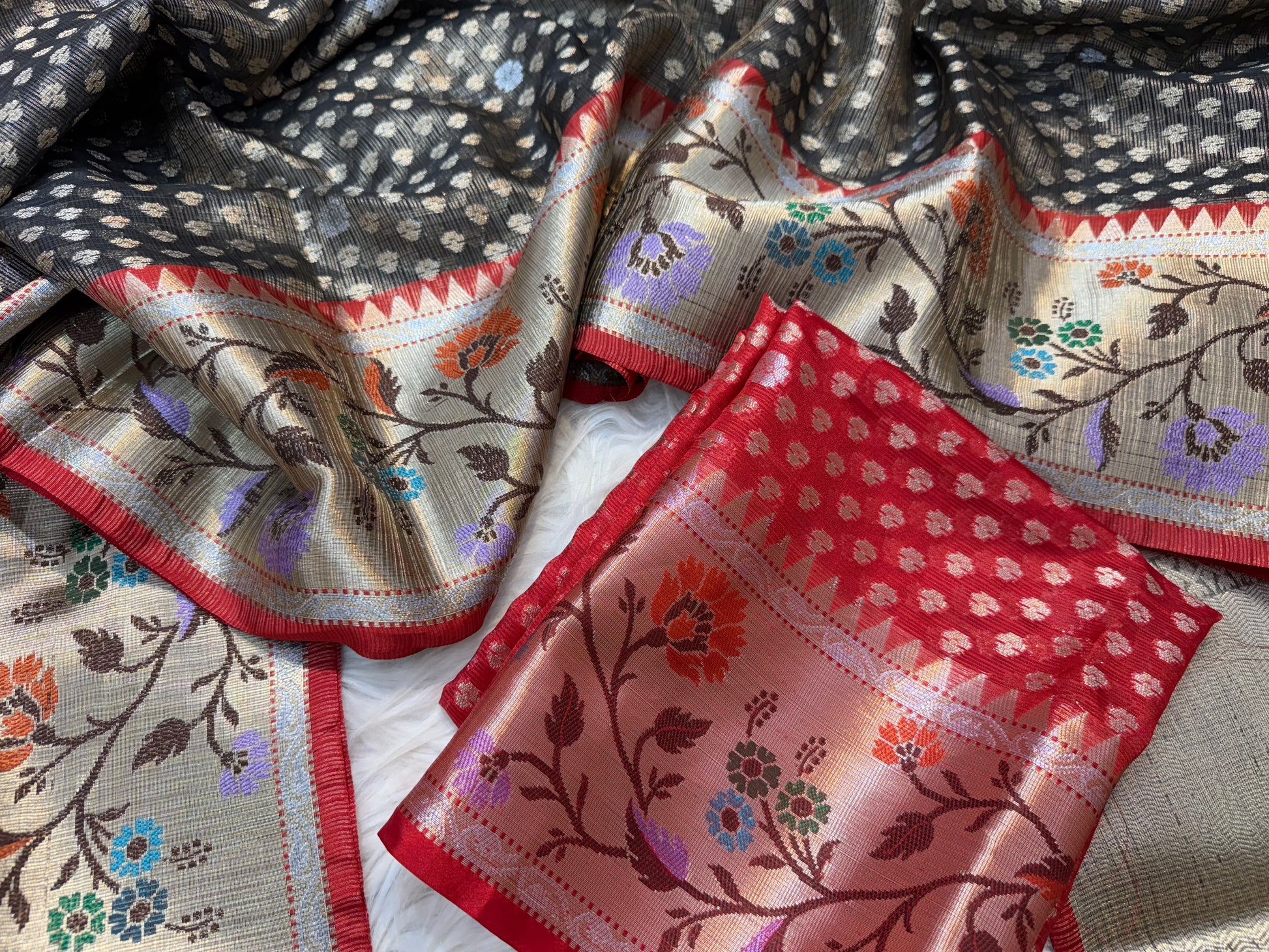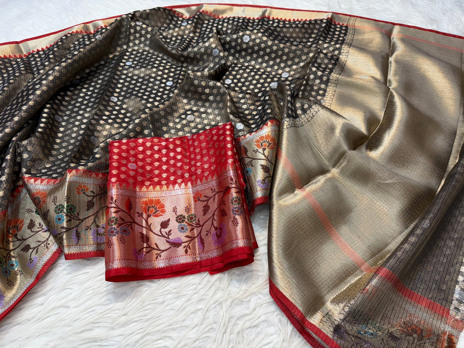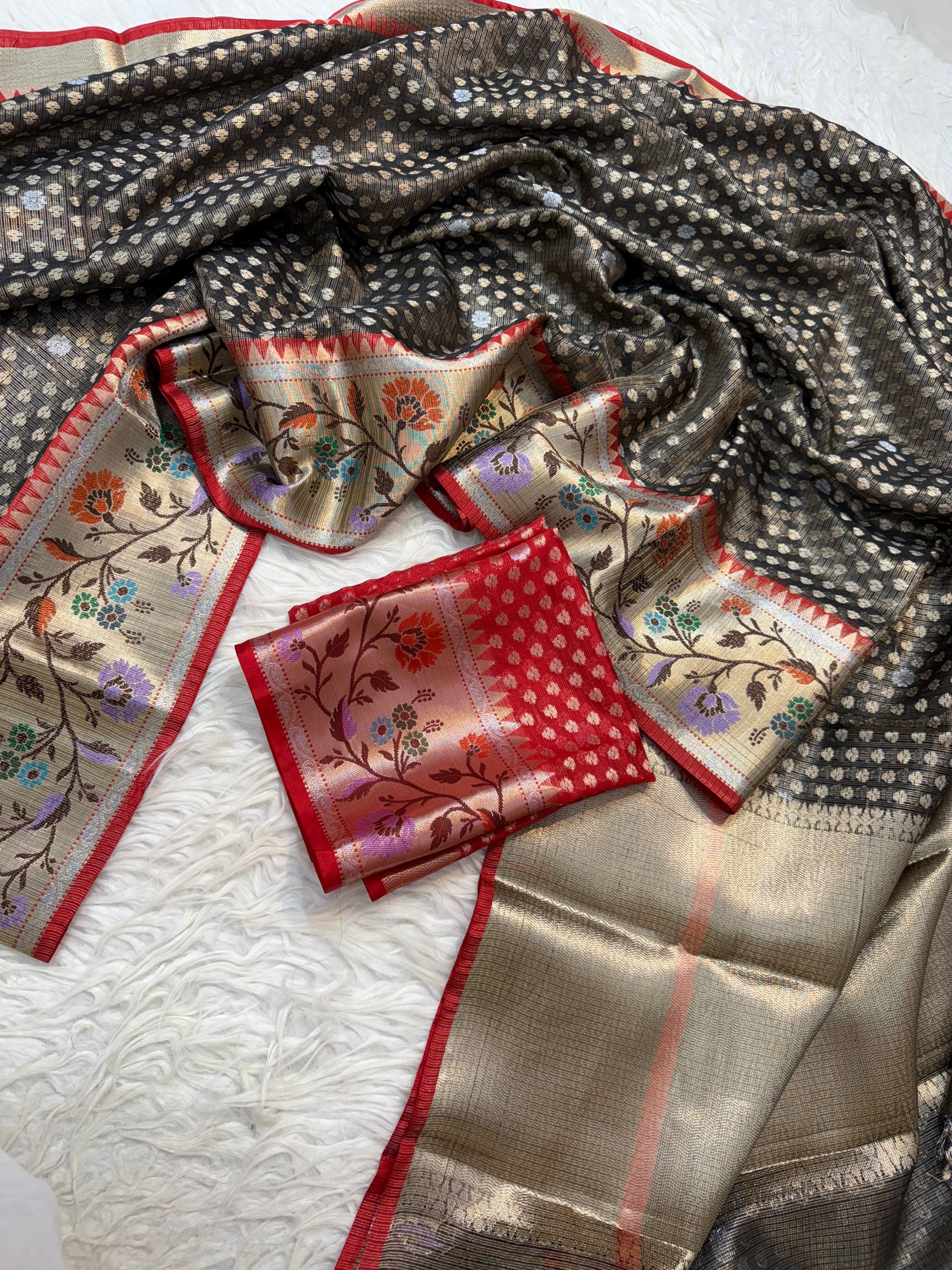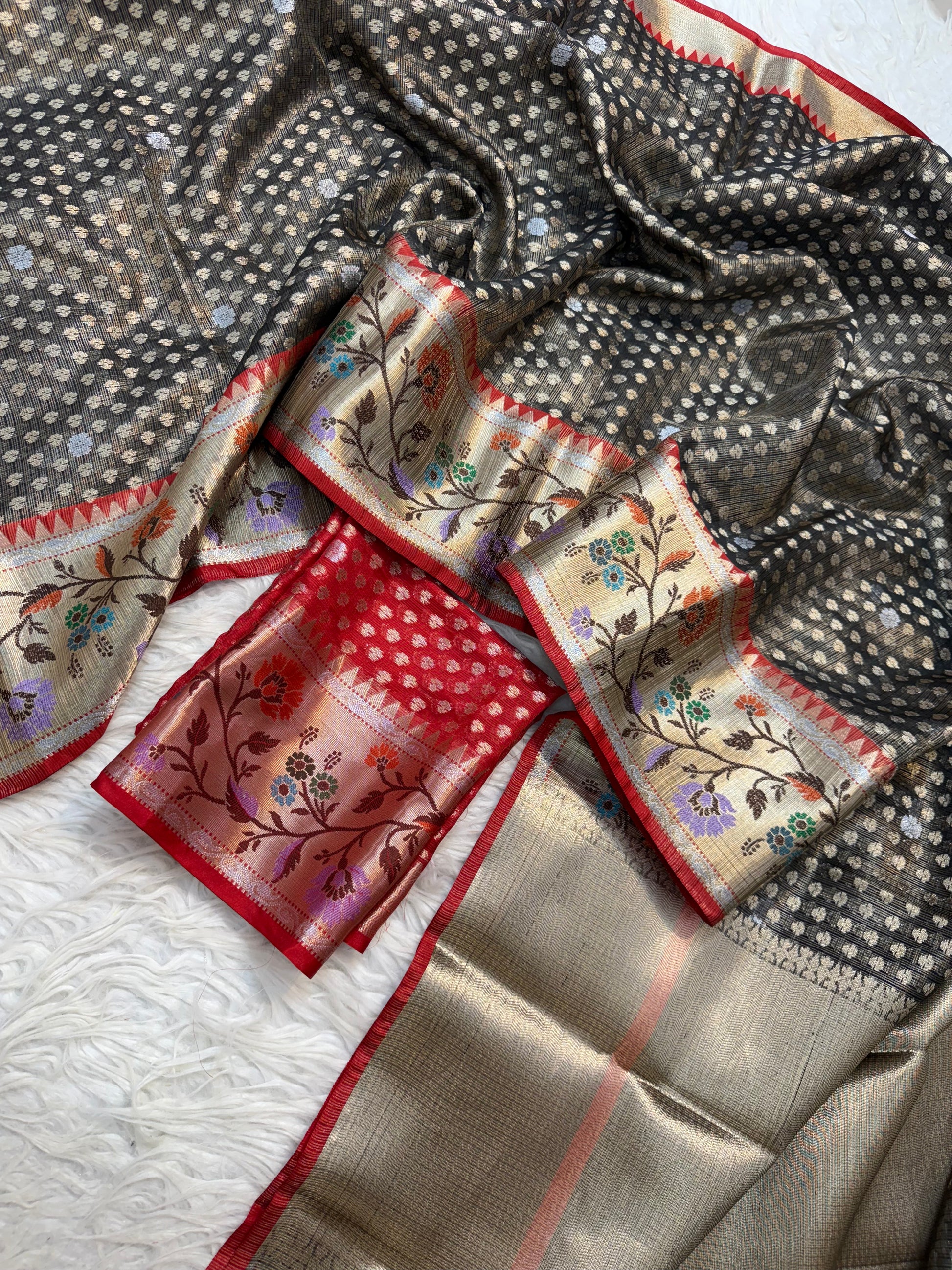 Black & red shade tissue kota premium paithani border banarasi saree