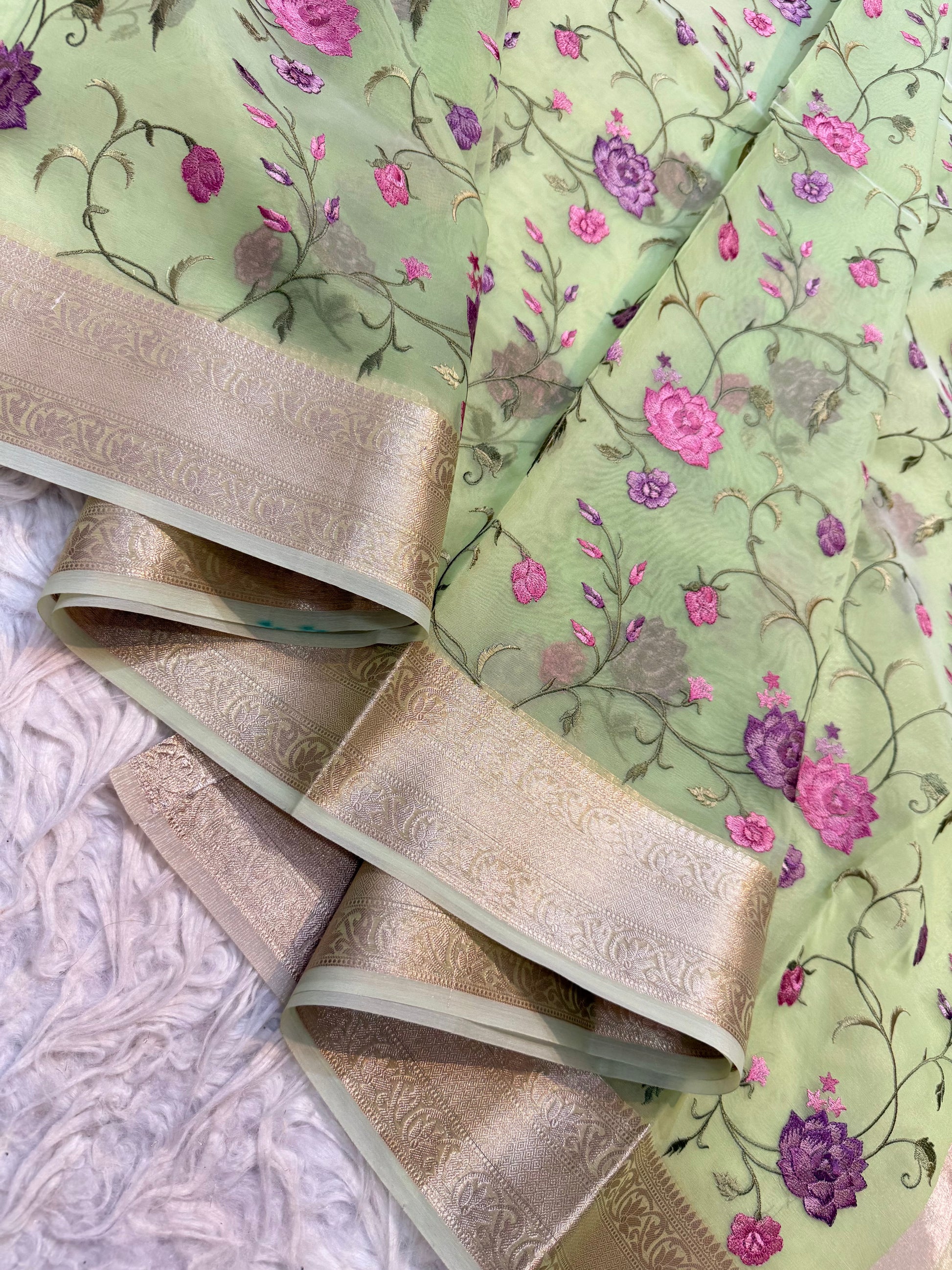 Pista green shade organza embroidery Banarasi saree