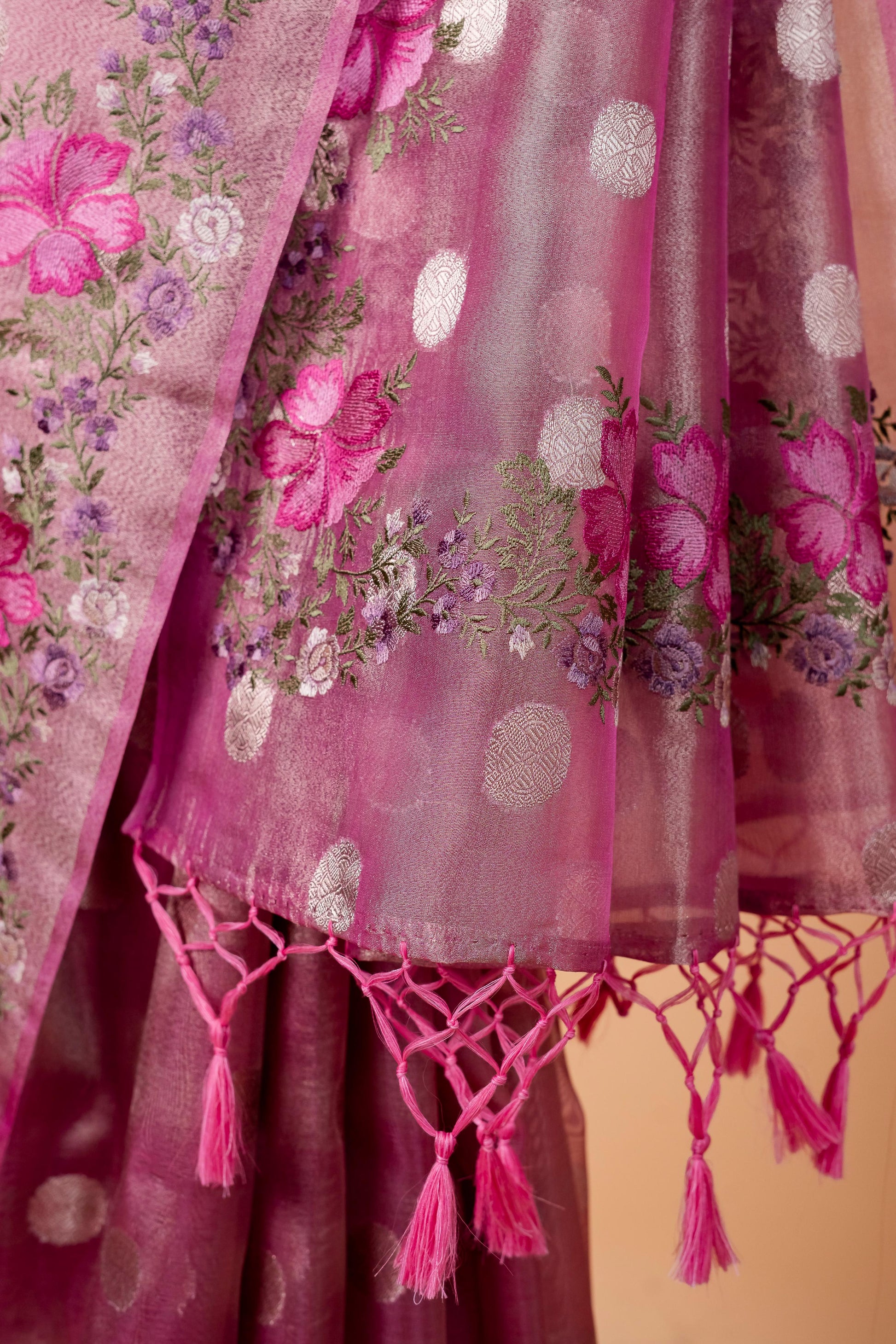 Pink Tissue Designer Embroidery Premium Banarasi Saree