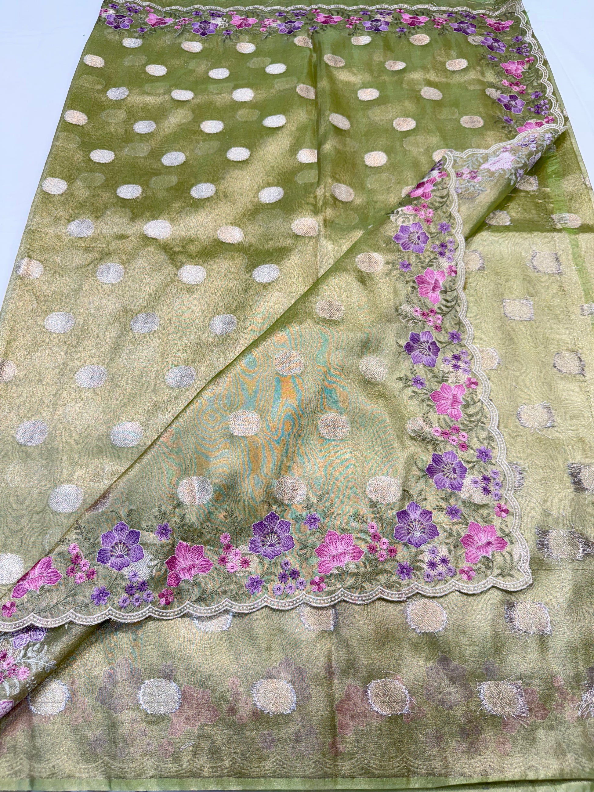 Pista green tissue cutwork embroidery premium designer Banarasi saree