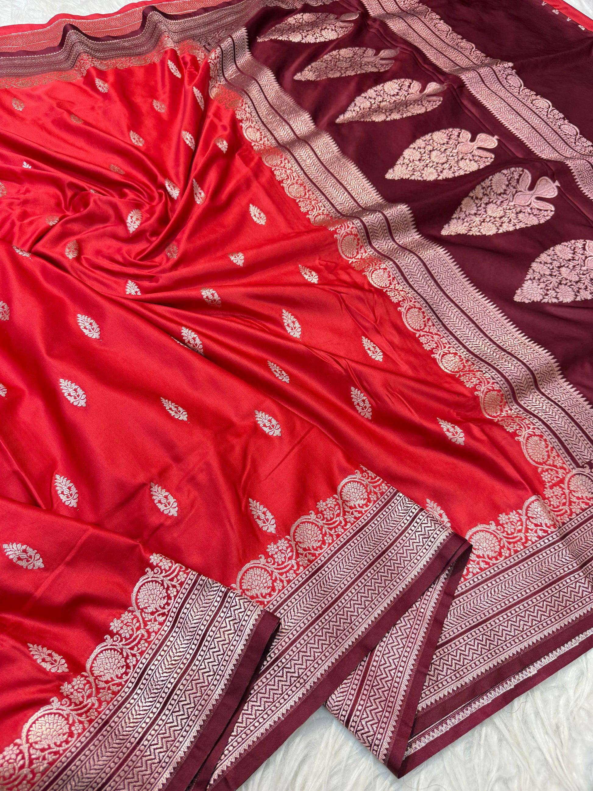 Discover the luxurious world of Zahera Silk Banaras with our Mashru Silk Banarasi Saree. Crafted from the finest Mashru Silk, this saree combines opulence with tradition. Adorn yourself with this exclusive piece and experience the elegance and grace of Banarasi artistry.