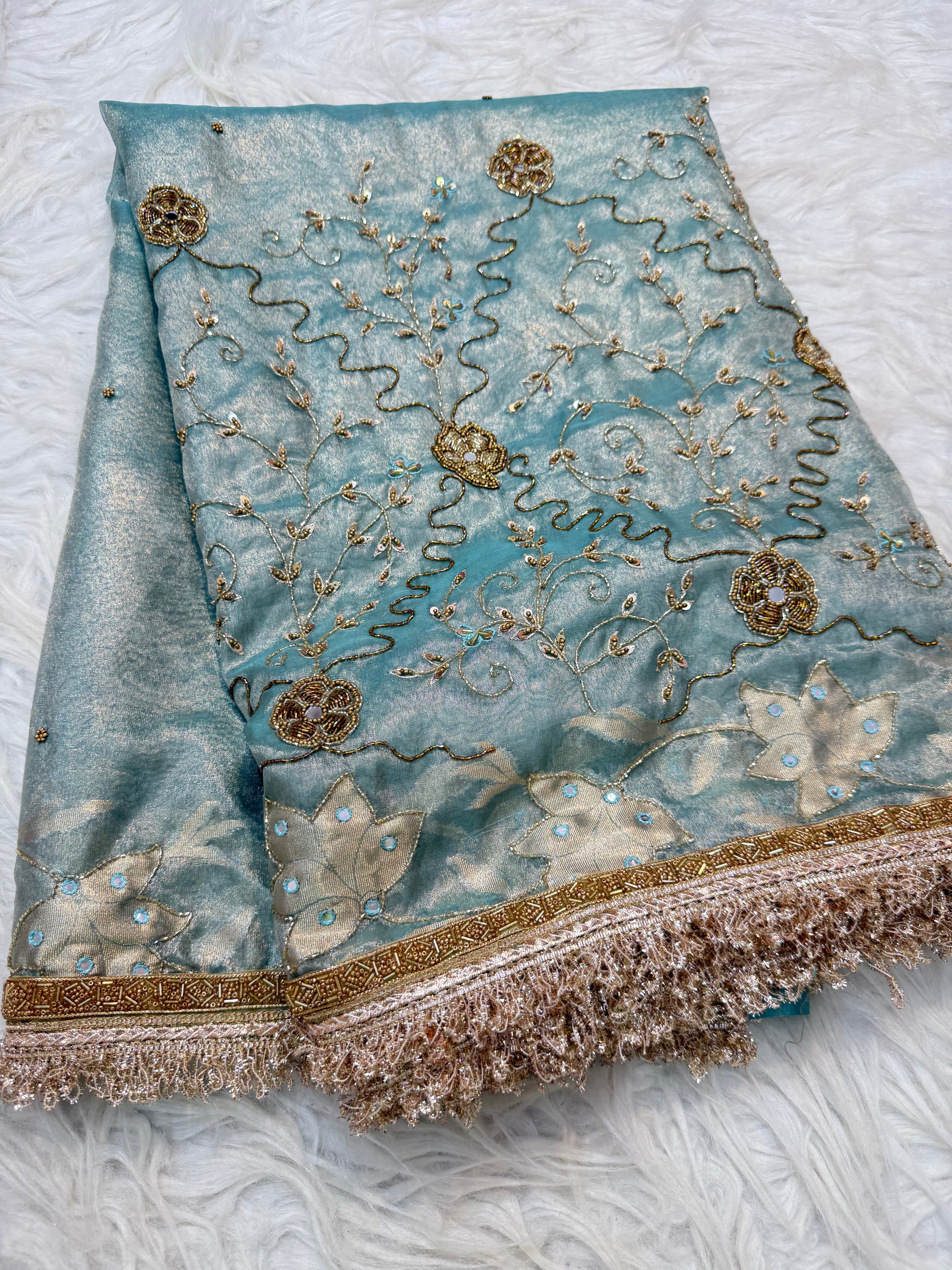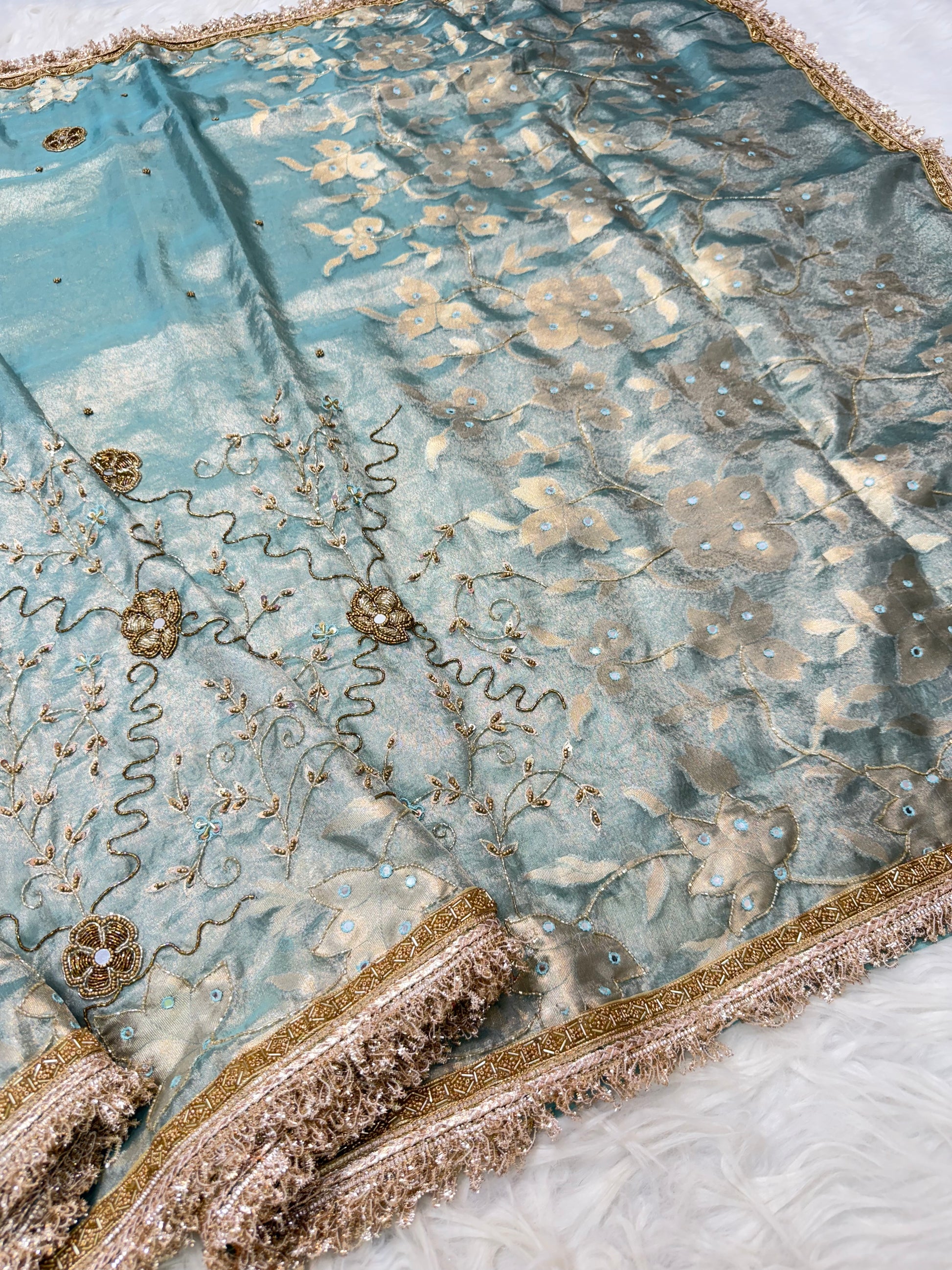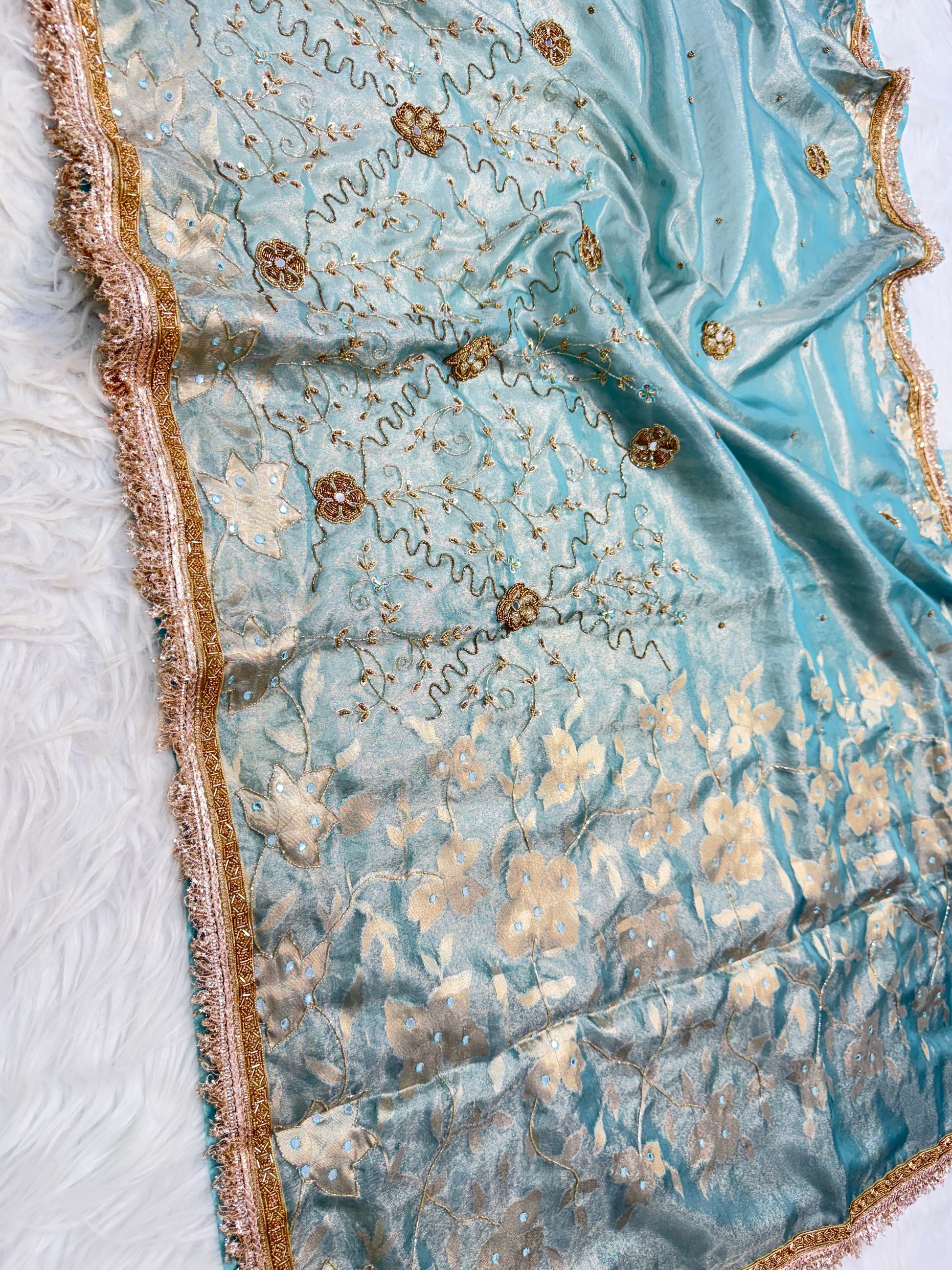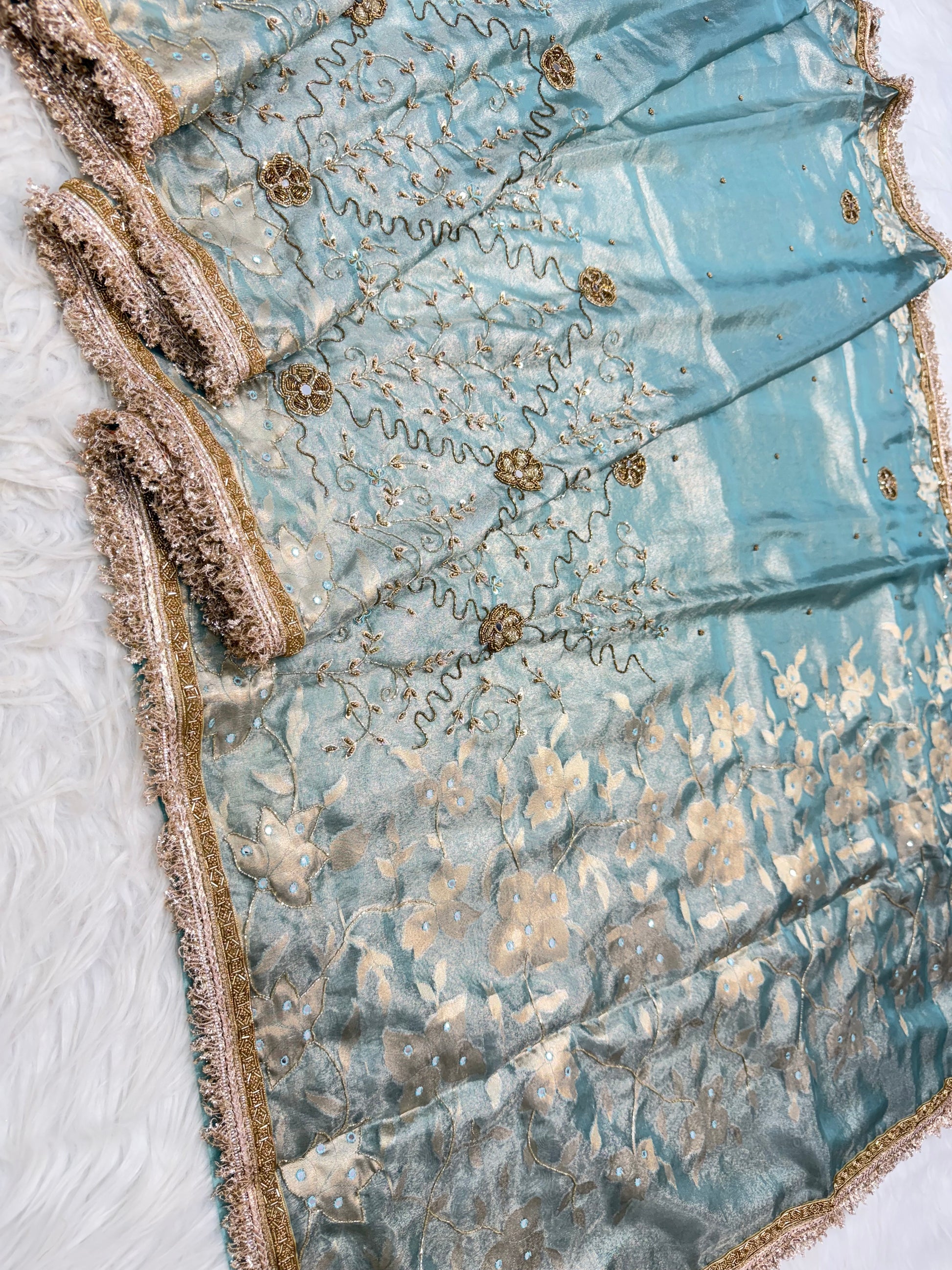 Sea green shade tissue ari & zardosi work designer premium Banarasi saree